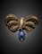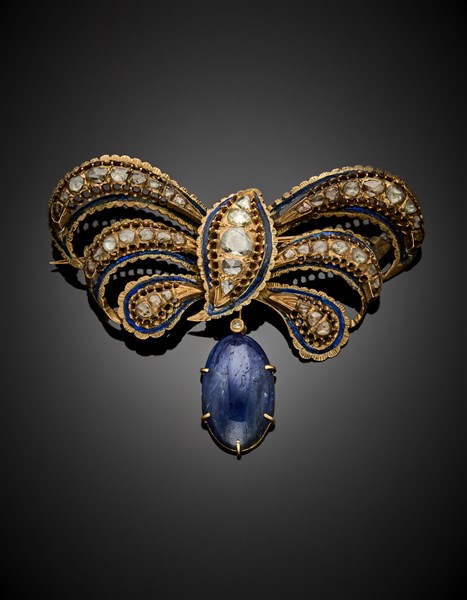 Spilla a fiocco in oro giallo 333/1000 con smalti, diamanti a mezza rosetta e uno zaffiro ovale cabochon pendente, g 21,90 circa, largh. cm 6,70 circa.