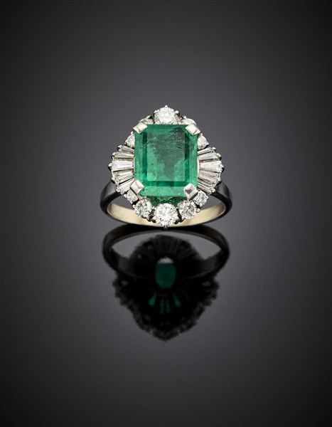 Anello in oro bianco con smeraldo ottagonale di ct. 4,00 circa e diamanti rotondi e tapered, g 6,06 circa misura 12/52. In scatola