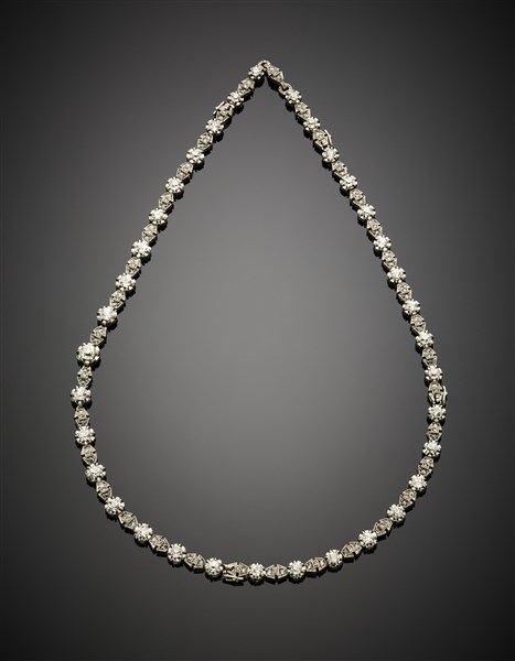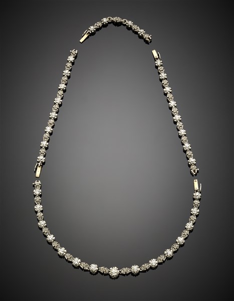 Collier leggermente a scalare in platino e diamanti rotondi e a mezza rosetta p