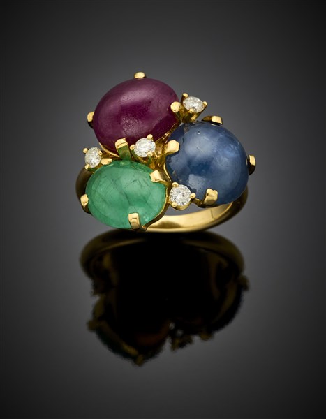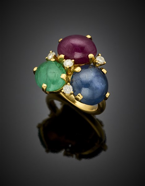 Anello in oro giallo con smeraldo, rubino e zaffiro cabochon rifinito in diamanti, g 9,60 circa misura 14/54. Firmato Seaman Schepps, 1915.
