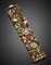 Bracciale a fascia con fiori, frutti e animali in oro giallo e bianco, diamanti, pietre varie in parte sintetiche e smalti, g 153,54 circa, lungh. cm 17,80 circa. Firmato e marcato Santagostino, 3656 AL.