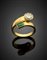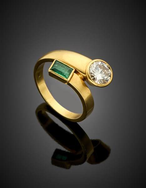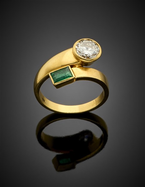 Anello in oro giallo a contrarié con diamante rotondo di ct. 1,05 circa e smeraldo ottagonale, g 7,43 circa misura 16/56.
