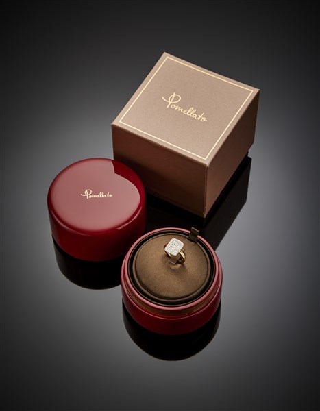 Anello in oro rosa e bianco con pavé di diamanti rotondi, g 6,28 circa misura 13/53. Firmato, marcato e numerato Pomellato, 3022 AL, 53, C190033510. In scatola e confezione originali
