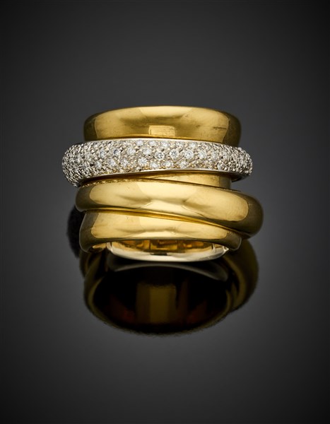 Bi-coloured gold band ring with movable elements, one finished with diamonds, g 25.60 circa size 13/53. Signed Pomellato.