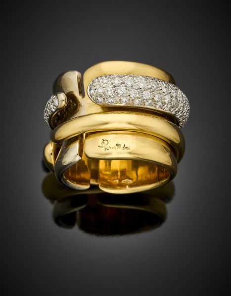 Anello in oro giallo e bianco a fascia con elementi mobili, uno rifinito in diamanti, g 25,60 circa misura 13/53. Firmato Pomellato.