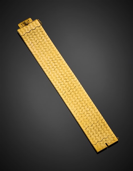 Yellow gold chiseled band bracelet, g 89.74 circa, length cm 18.50, h cm 2.90 circa. Marked RM, 363 MI.
