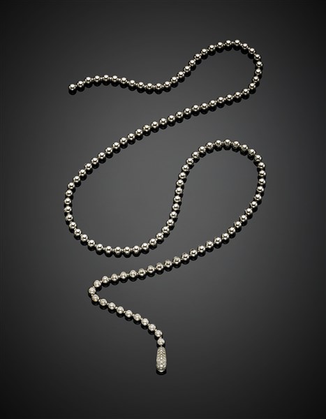 White gold adjustable bead necklace finisheded with diamonds in all ct. 2.10 circa, g 59.99 circa, length cm 56 circa. Signed Cartier, n° 838930, french goldsmith and assay marks.