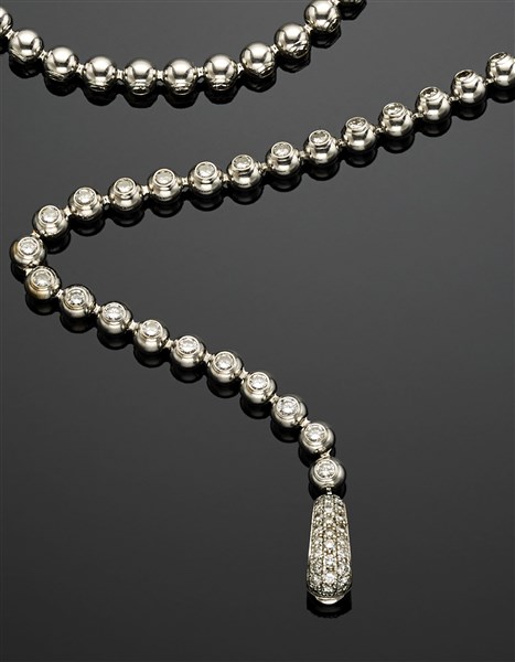 Collier a lunghezza regolabile in boule di oro bianco rifinite in diamanti per complessivi ct. 2,10 circa, g 59,99 circa, lungh. cm 56 circa. Firmato Cartier, n° 838930, orefice e marchi di assaggio francesi.