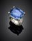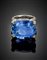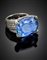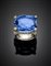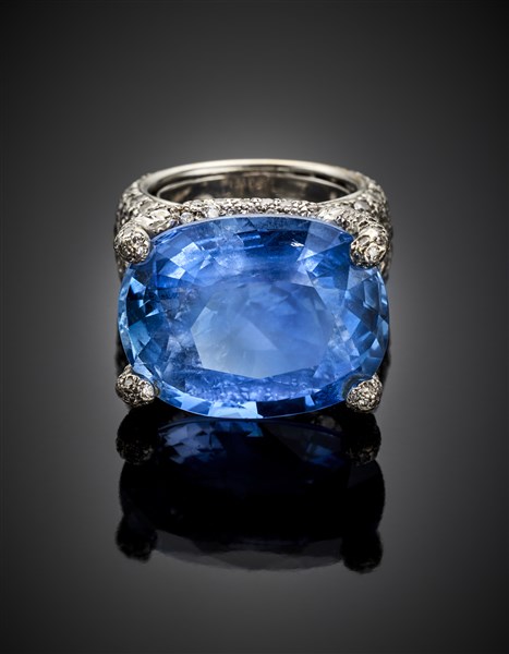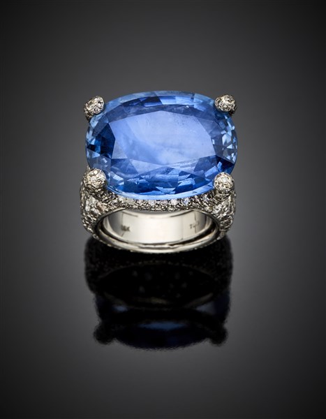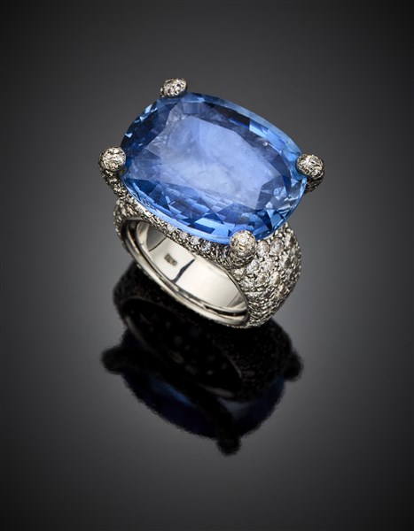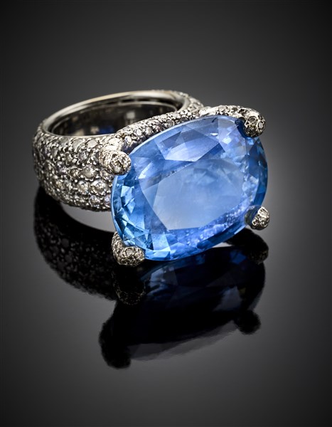 Anello in oro bianco con zaffiro a cuscino di mm 20.86x18.81 circa e rifinito con pavè di diamanti per complessivi ct. 1,75 circa, g 15,41 circa misura 12/52. (mancanze)