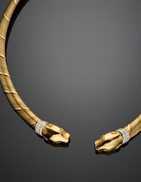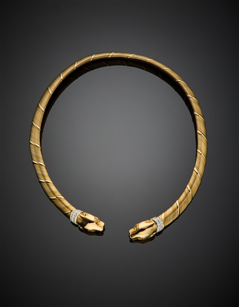 Three coloured gold torque necklace ending with two panther heads with white gold and diamond collars, g 92.38 circa, diam. cm 12 circa. Signed Cartier, 1990, A7272. (slight defects)