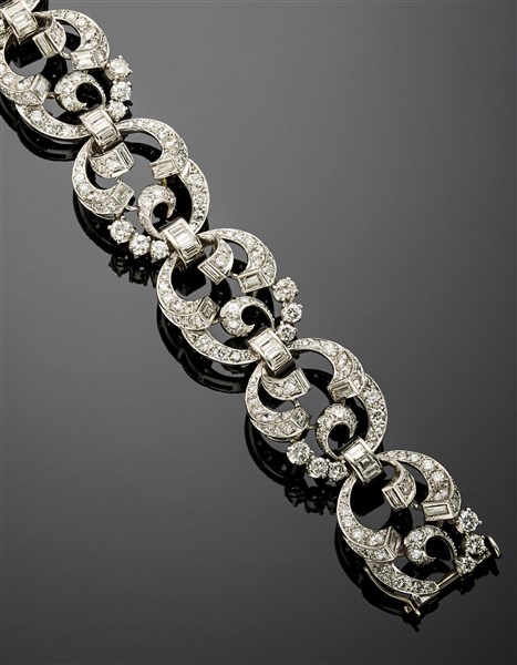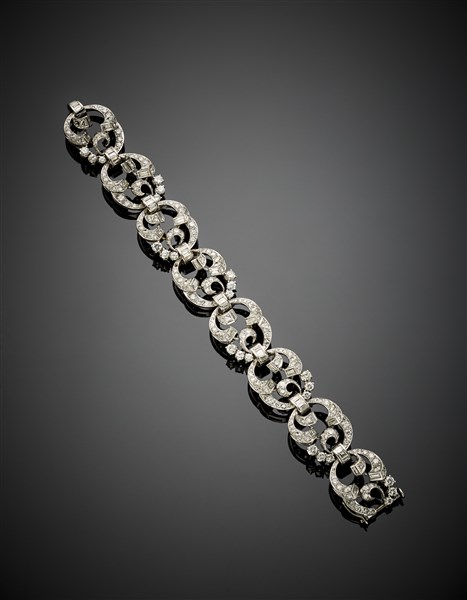 Bracciale modulare in oro bianco con diamanti rotondi e a baguette per complessivi ct. 9 circa, g 55,87 circa, lungh. cm 18,50 circa. (mancanze)