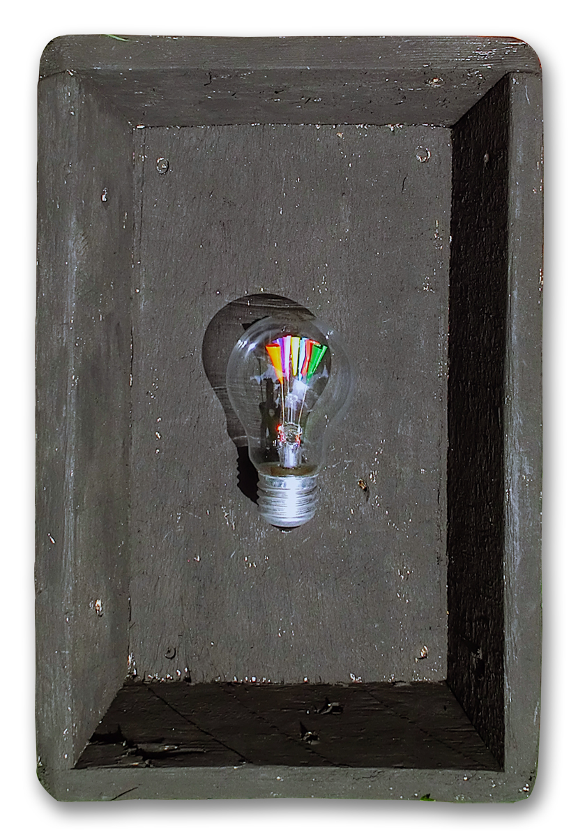 Lampadina ad incandescenza industriale, pastelli a cera, legno, acrilico.