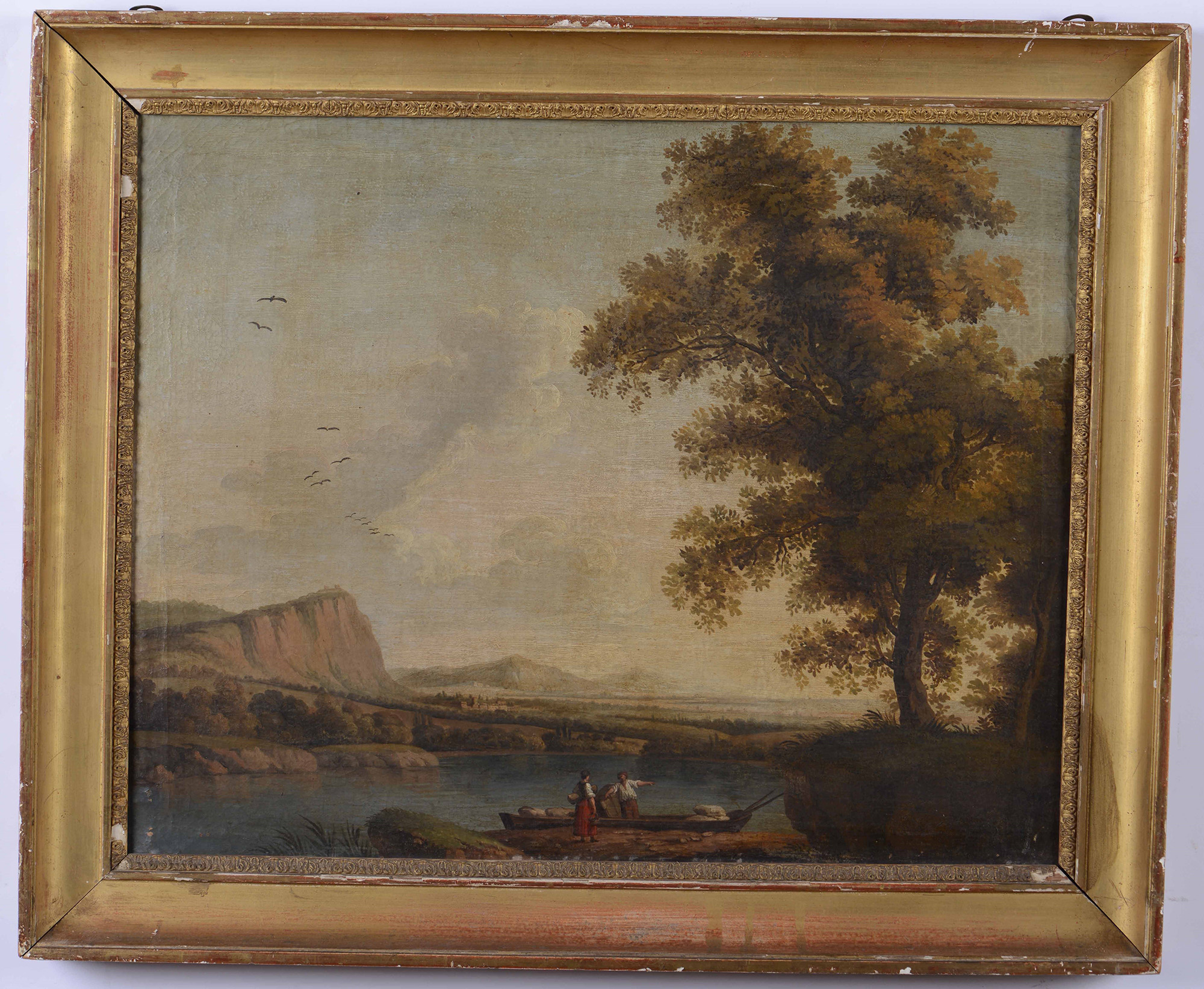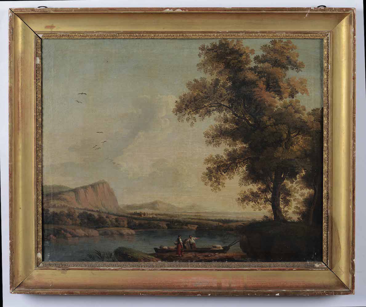 Paesaggio con pescatore Scuola romana del XVIII secolo, olio su tela, W. 69 - H. 48 cm