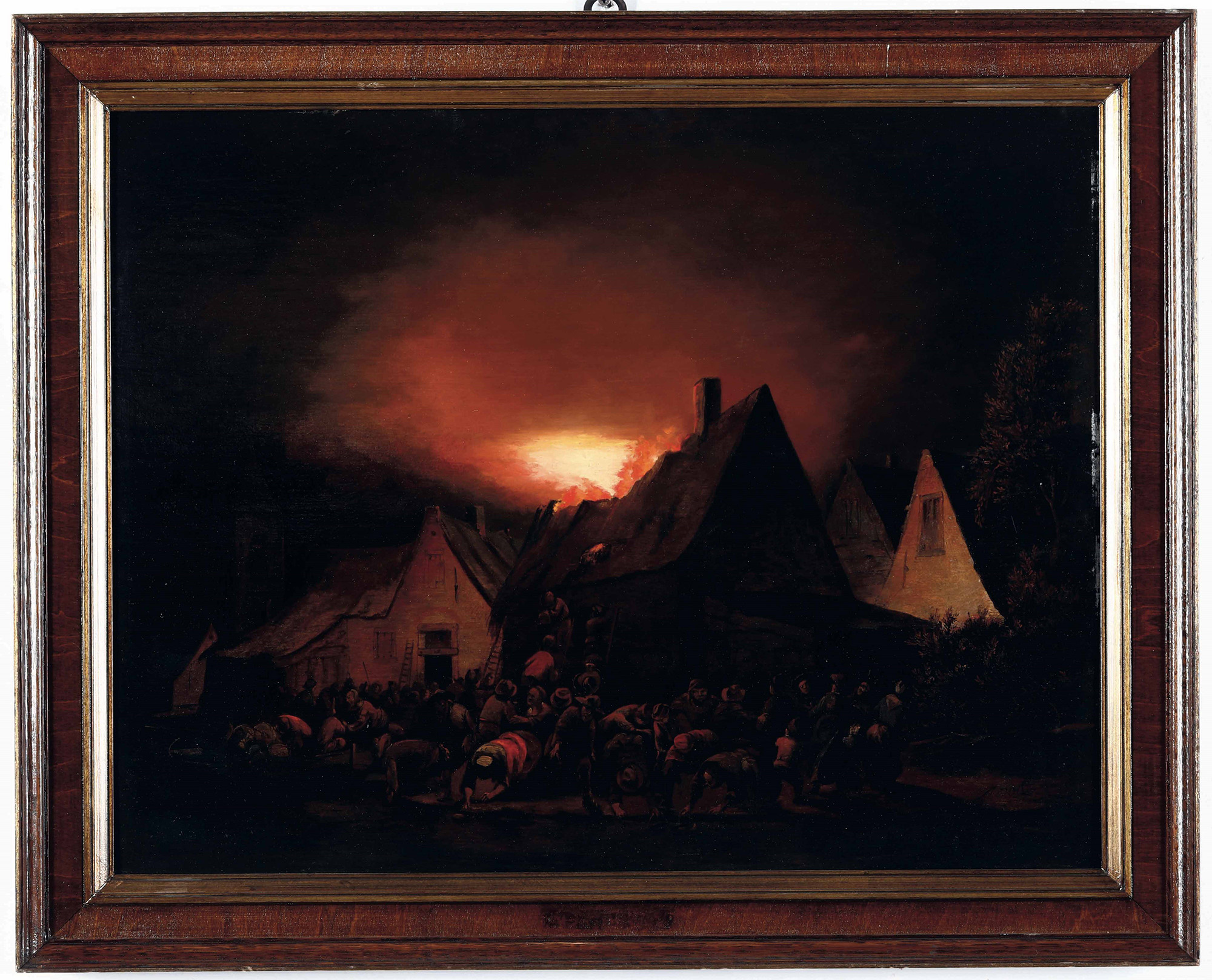 Adriaen Lievensz van der Poel (1628 Delft -1671 Leida ), Incendio notturno, Firmato, olio su tavola, W. 70 - H. 47 Cm, Expertise: Dott.ssa R. Colace