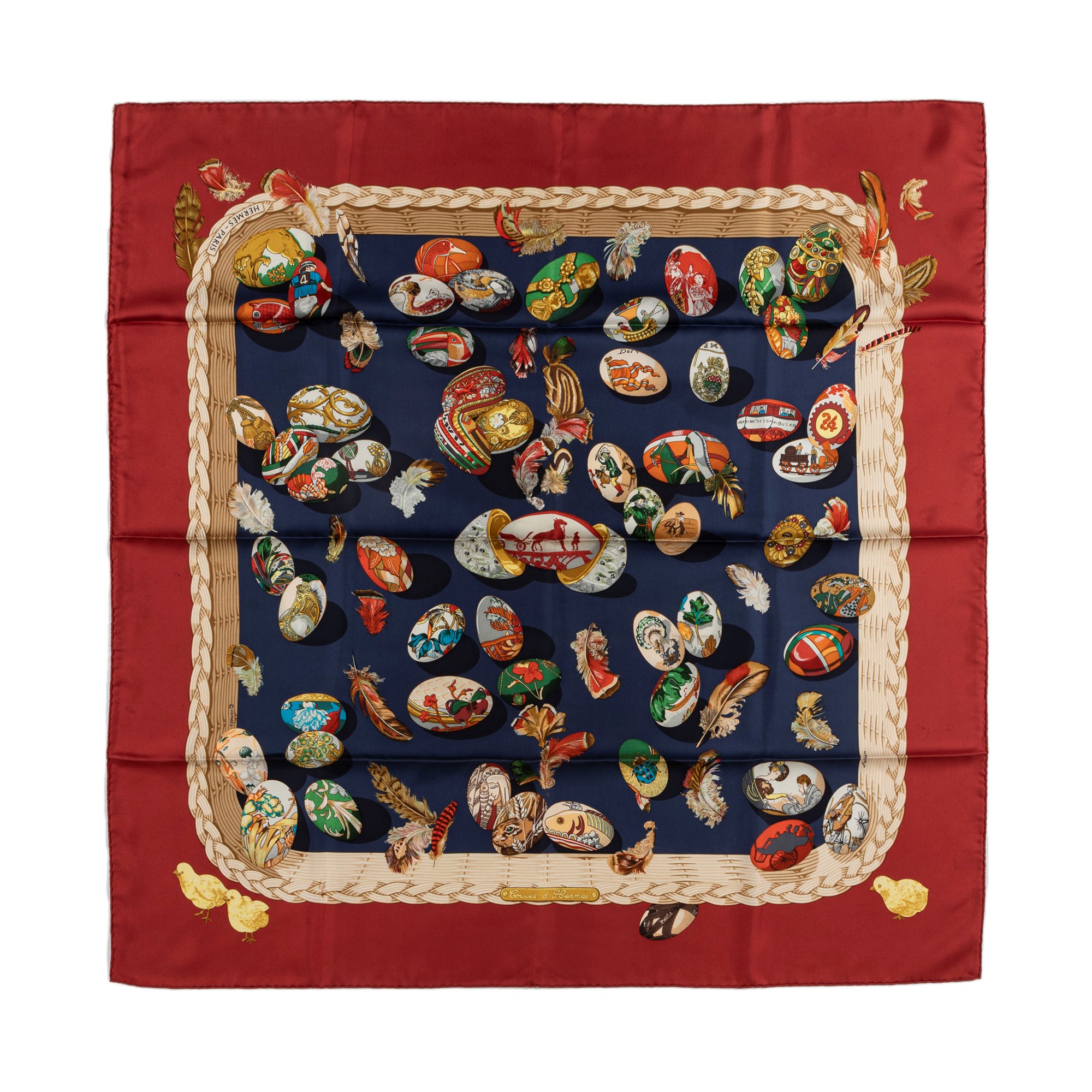 in seta su fondo color blu, bordo color rosso, Caty Latham (difetti).