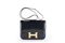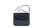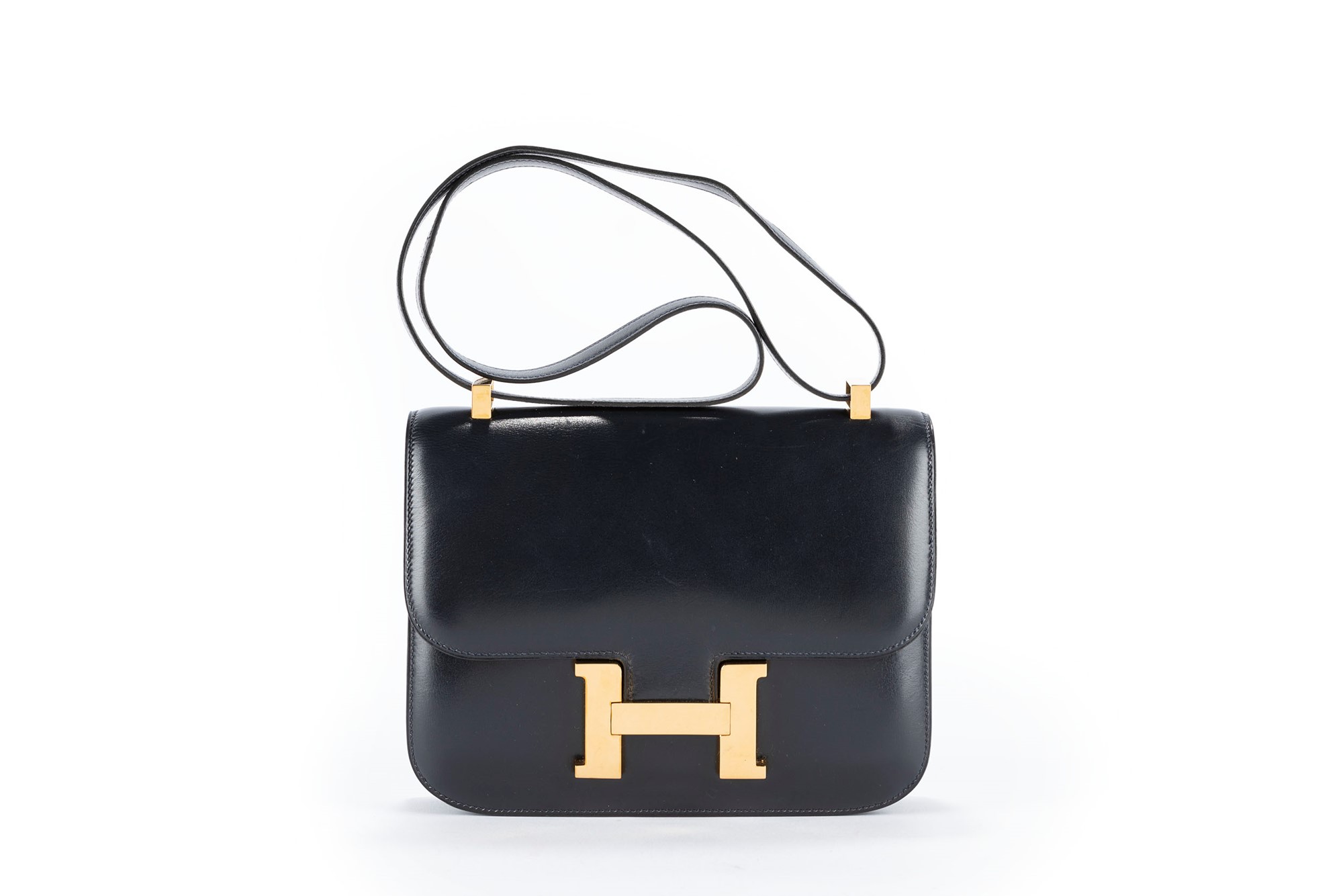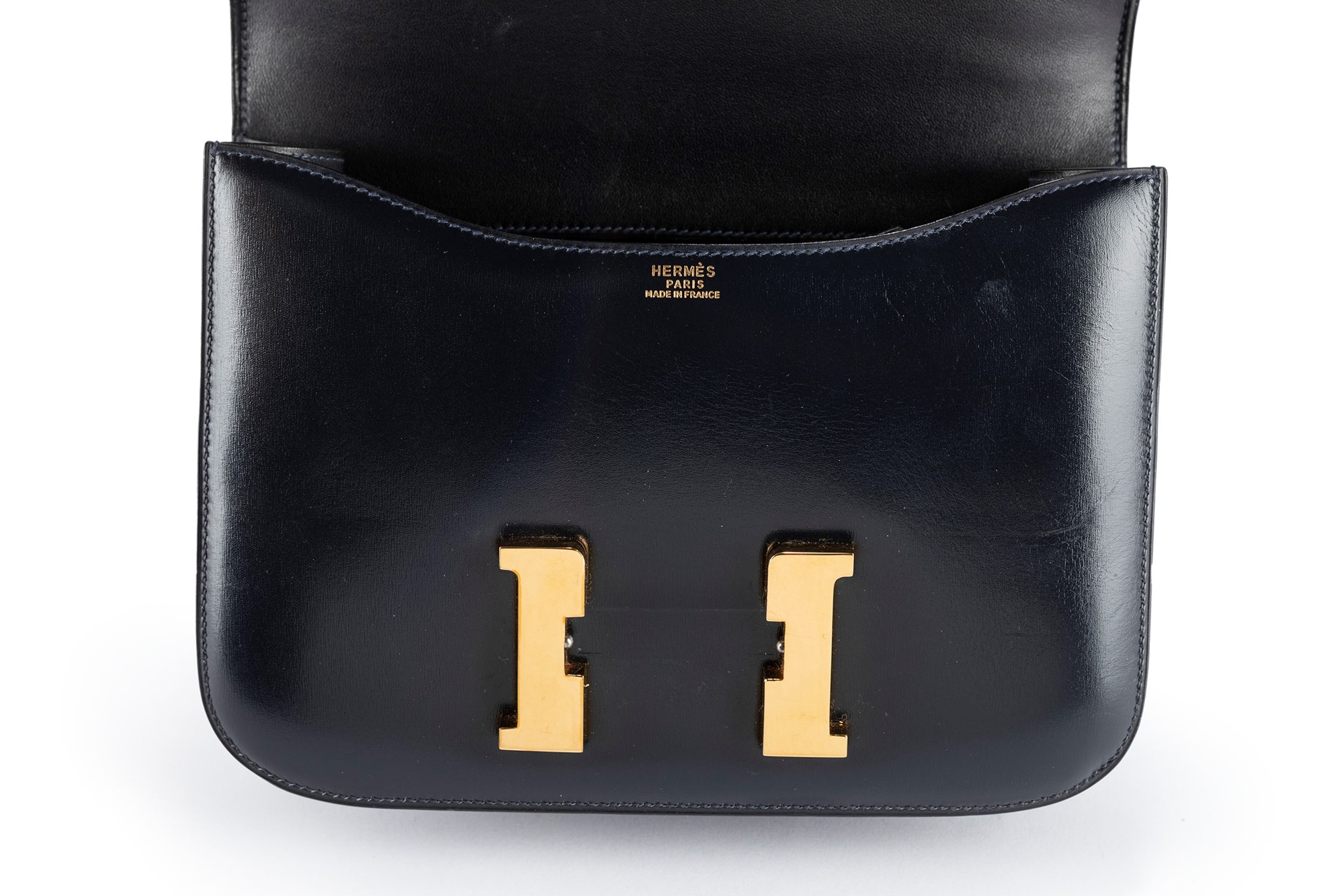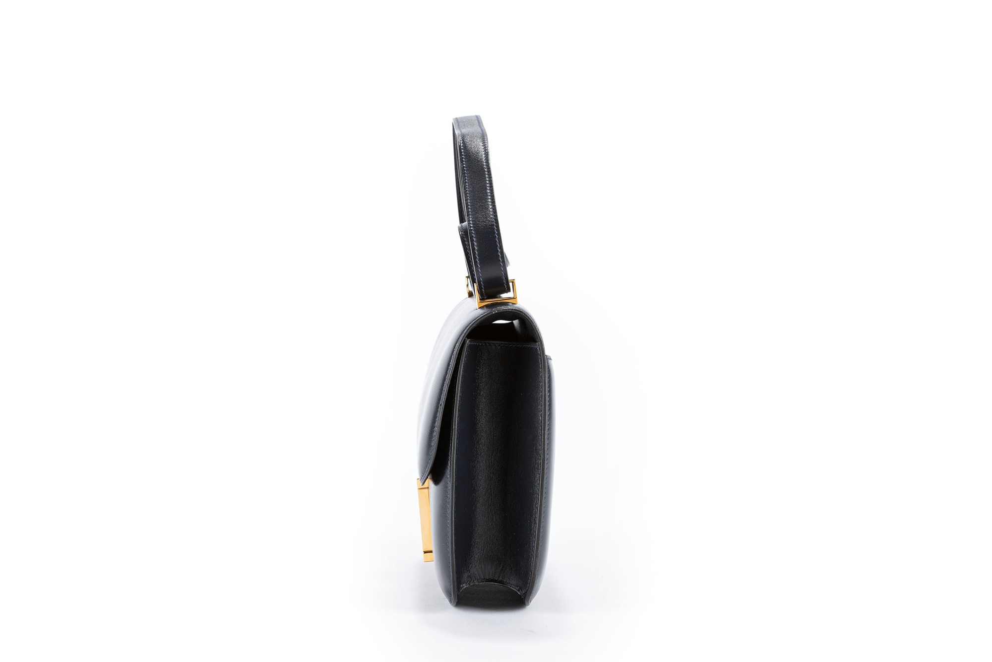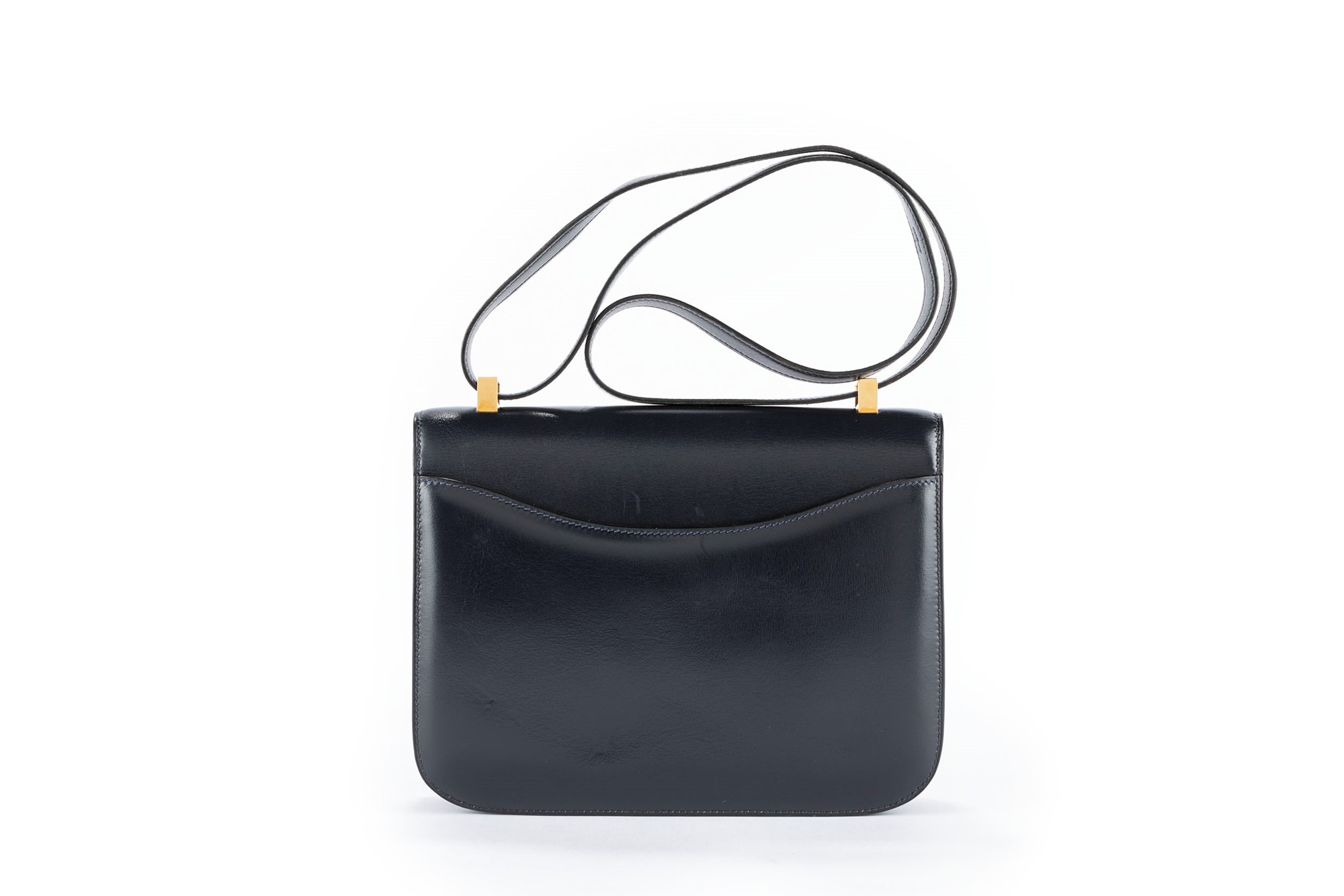 in pelle color blu scuro, dettagli in metallo dorato, cm 23, con scatola (lievissimi difetti).