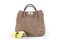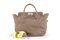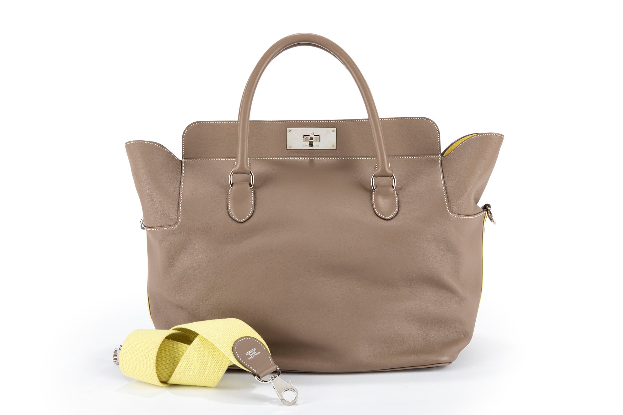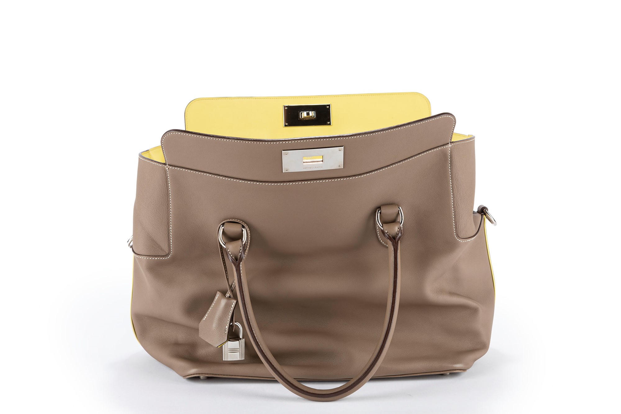 in pelle color étoupe, interno e tracolla in tela staccabile color giallo chiaro, con lucchetto e chiavi in palladio, cm 33 (lievissimi difetti).