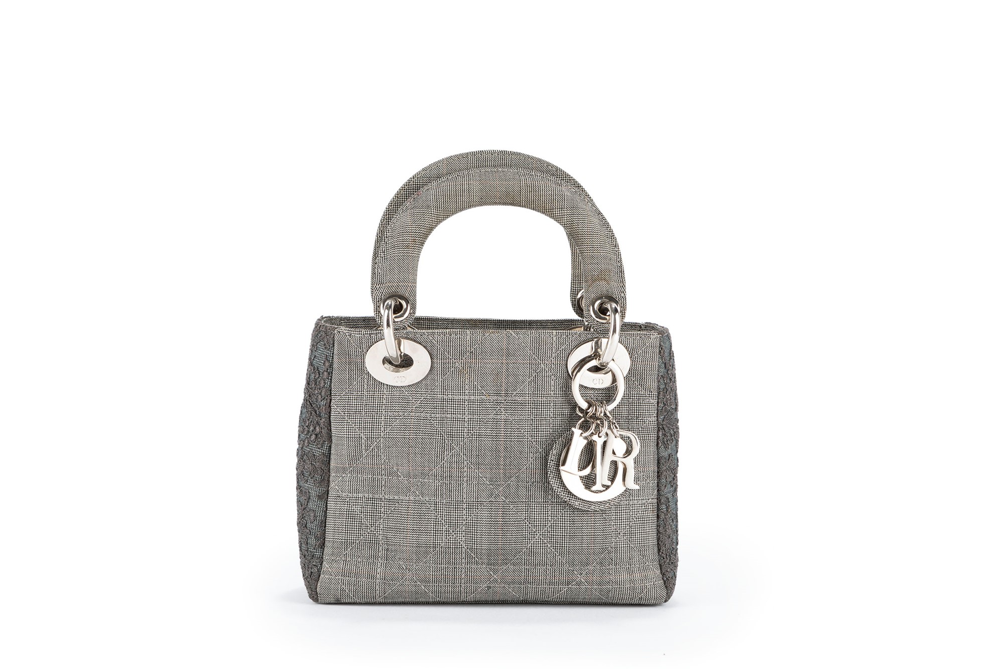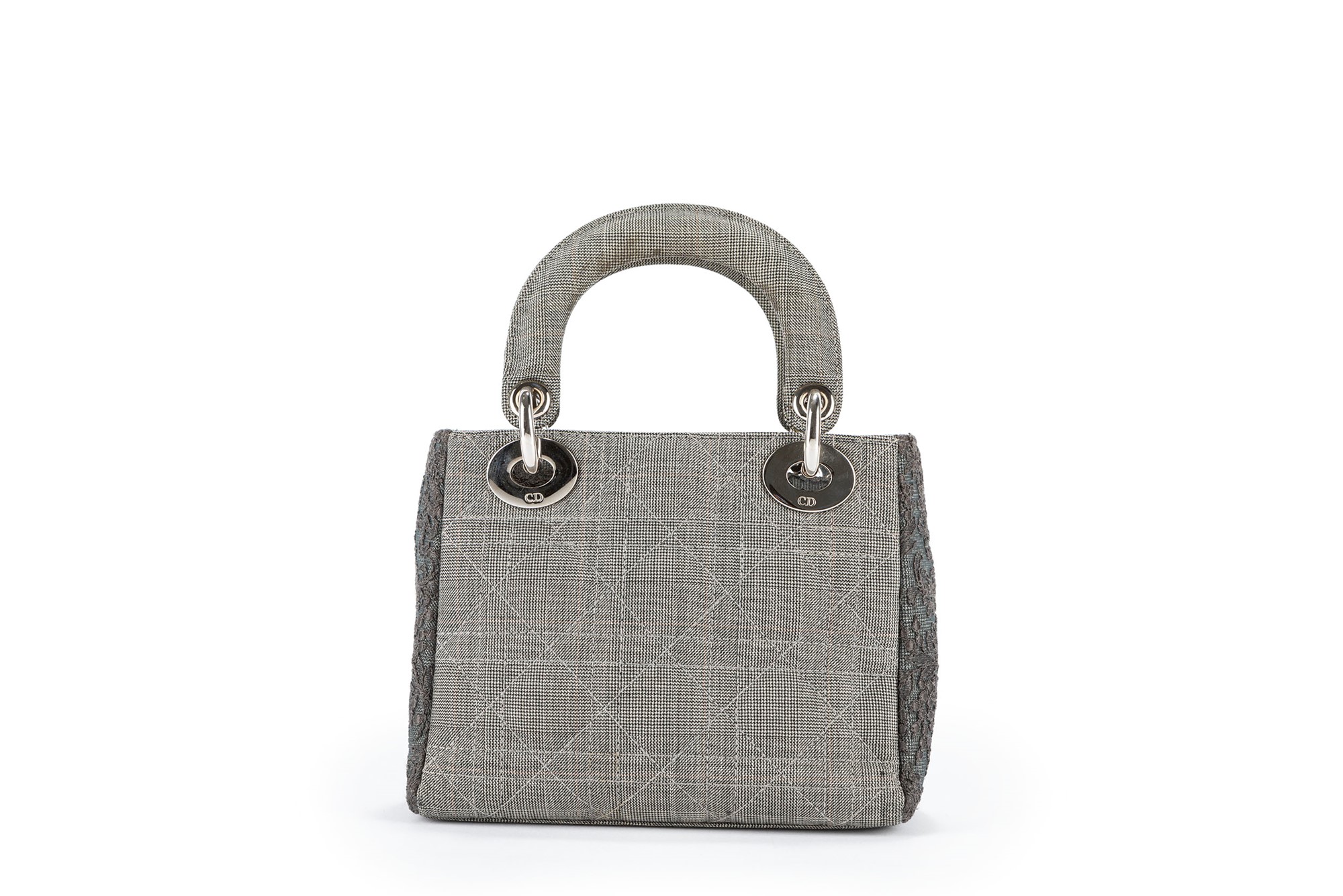 in tessuto principe di galles e pizzo tonalità grigio, dettagli in metallo, cm 18 (difetti).