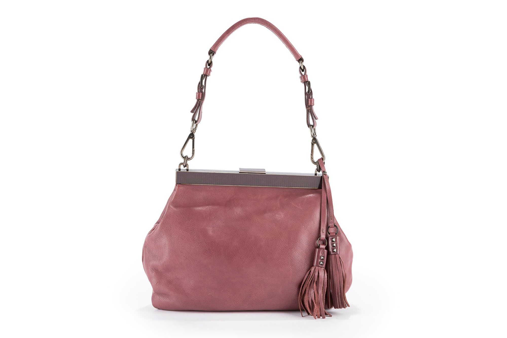 color prugna, chiusura in metallo brunito e smalto, charms con nappe, interno color ciclamino, cm 26, con sacchetto (difetti).