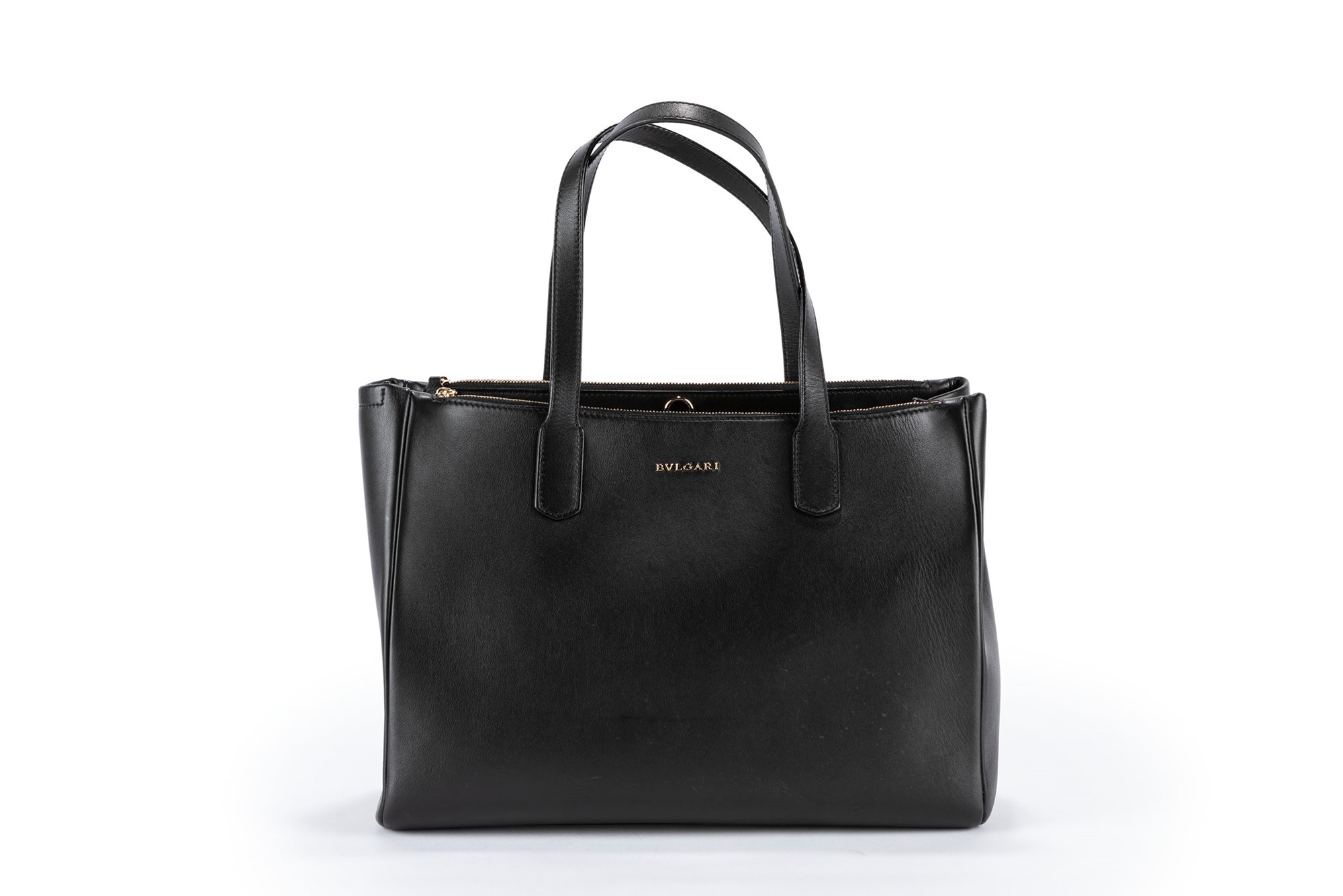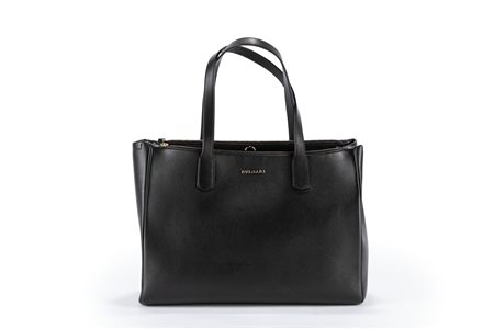 in pelle color nero, doppi manici, dettagli in metallo dorato, con sacchetto, cm 35 (lievi difetti).