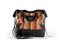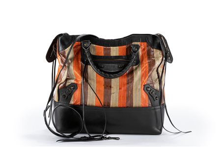 in pelle nera con inserti a bande verticali in diversi colori, chiusura a cerniera, doppi manici, tracolla staccabile, cm 37 (difetti).