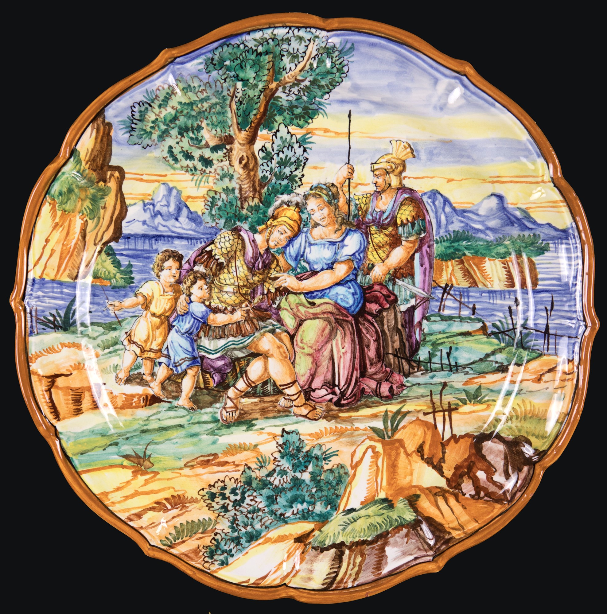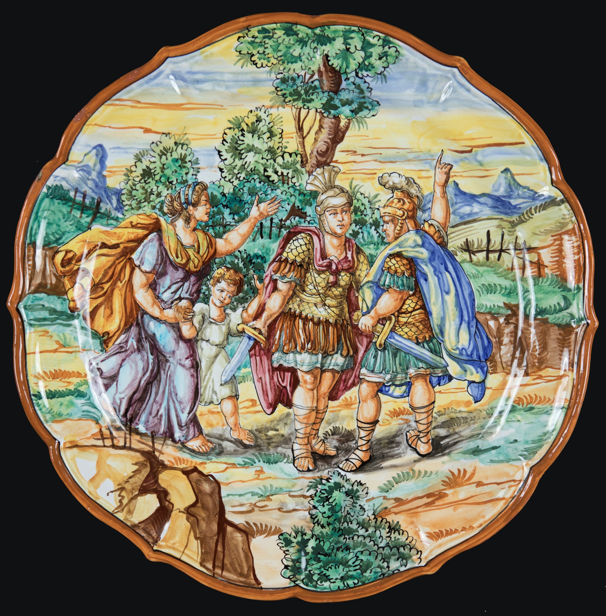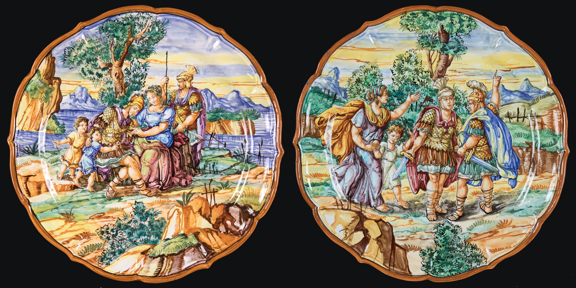 Coppia di piatti in maiolica di Castelli, ceramista G. Giunti, , diametro cm 36, decorati con scene storiche e bibliche; profilo lievemente sagomato sottolineato in ocra. Firmati al verso G. Giunti