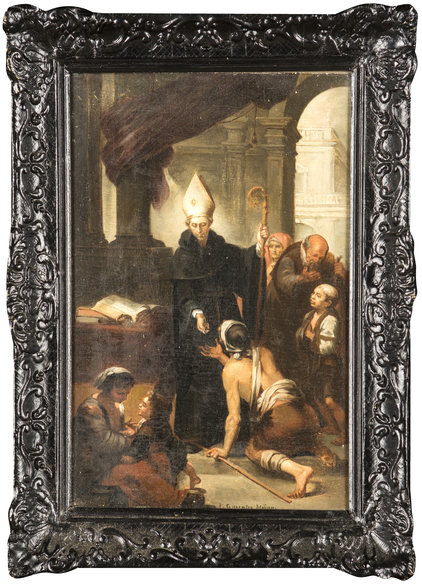 Scuola Veneta della fine del XVIII secolo, San Tommaso di Villanova distribuisce l'elemosina ai poveri, olio su tela, cm 34,5x23 - con la cornice: cm 42x30, dall'originale del pittore spagnolo Bartolomé Esteban Pérez Murillo (1617 - 1682) custodito a Siviglia al Museo delle Belle Arti. Firma non interamente decifrabile in basso al centro
