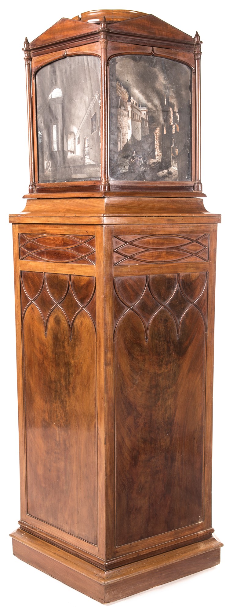 Mobile da centro con lanterna magica, Napoli, prima metà del XIX secolo, cm 157x37x37, struttura in ciliegio a pianta pentagonale girevole, con pannelli decorati superiormente da nervature curvilinee a creare motivi di gusto neogotico; la parte superiore, con sommità parzialmente chiusa con profilo in stagno, è caratterizzata da facciate delimitate da colonne angolari, sormontate da timpano; ognuna reca pannello con doppio vetro a contenere vedute retroilluminate dipinte ad inchiostro e acquerelli su carta la cui visione è resa migliore attraverso la luce disposta all'interno della struttura.