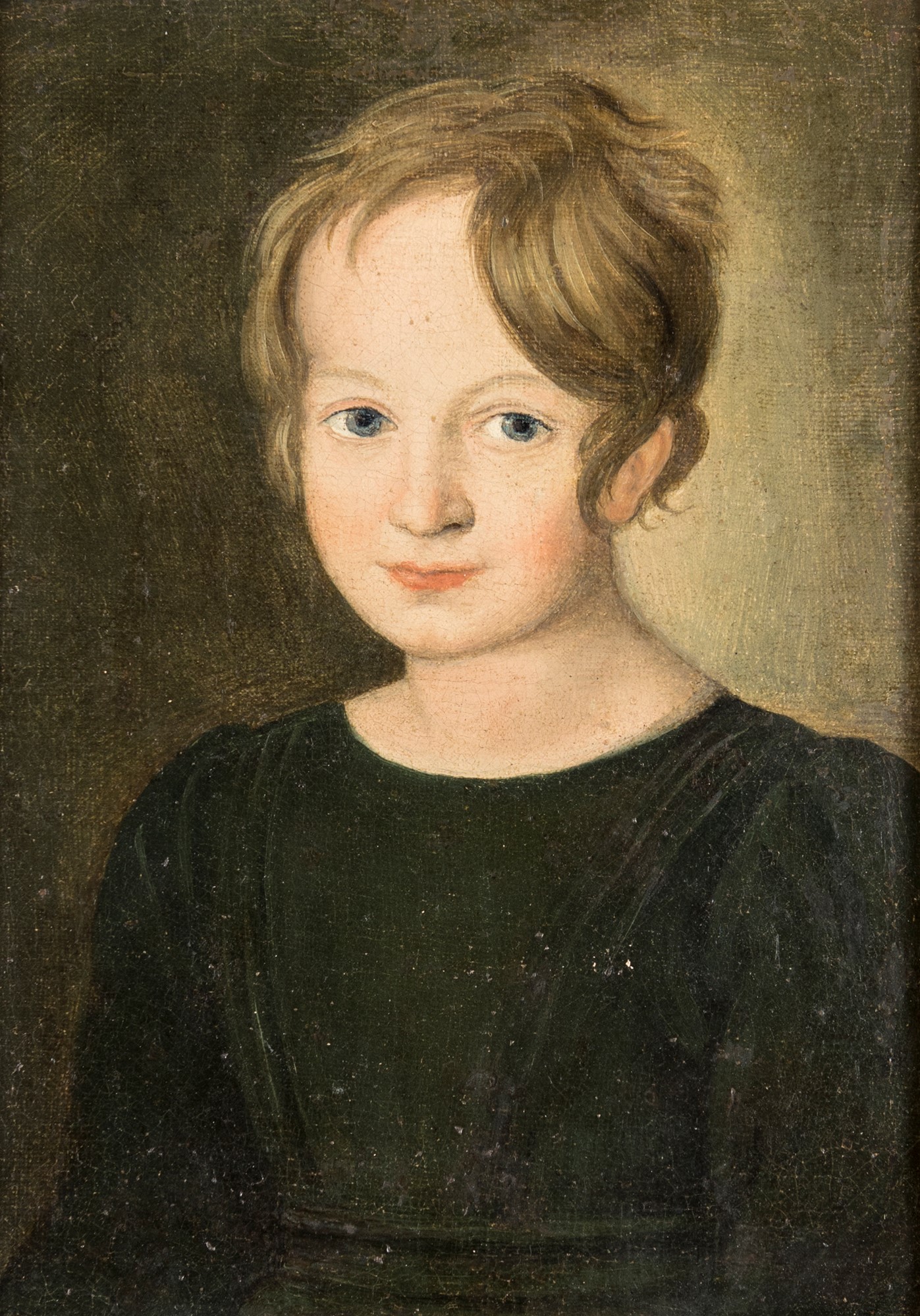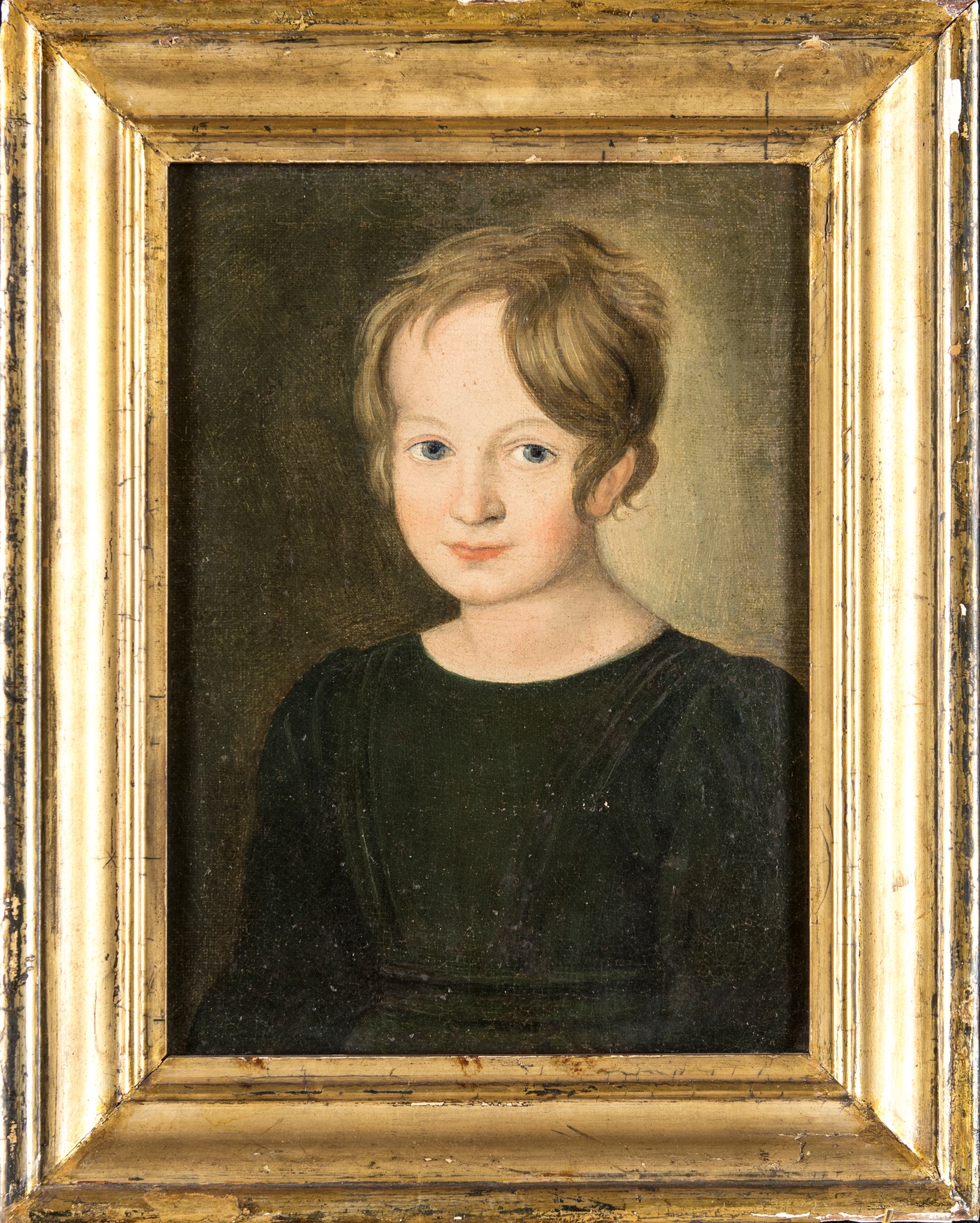 Pittore degli inizi del XIX secolo, Ritratto di bambina, olio su tela, cm 40x29 - con la cornice: cm 52,5x41,5, Entro cornice in legno dorato