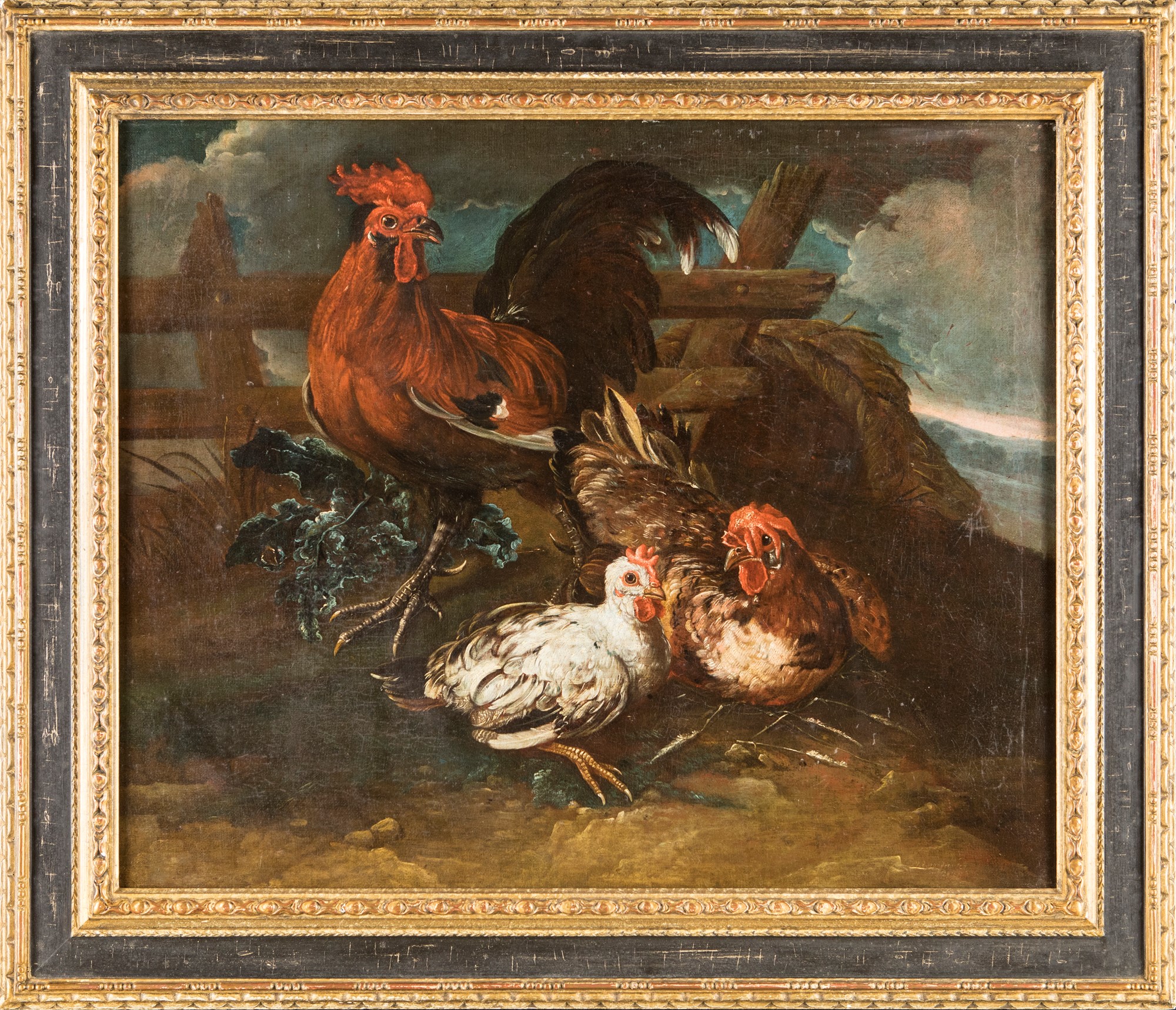 Giovanni Crivelli detto il Crivellino (attribuito) (1:Principale) (Parma, fine del XVII - Parma, 1760) Gallo e galline olio su tela cm 73x88 - con la cornice: cm 95x110