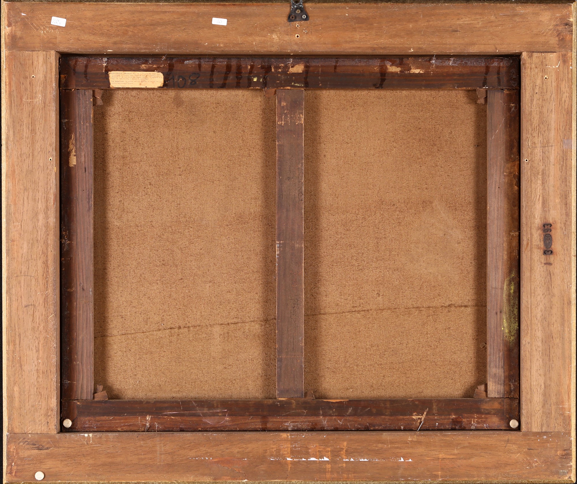 Giovanni Crivelli detto il Crivellino (attribuito) (Parma, fine del XVII - Parma, 1760) , Gallo e galline, olio su tela, cm 73x88 - con la cornice: cm 95x110, Al verso, etichetta su telaio con indicazione al pittore olandese seicentesco Melchior de Hondecoeter, o Hondecoutre, specializzato nella pittura di nature morte e animali