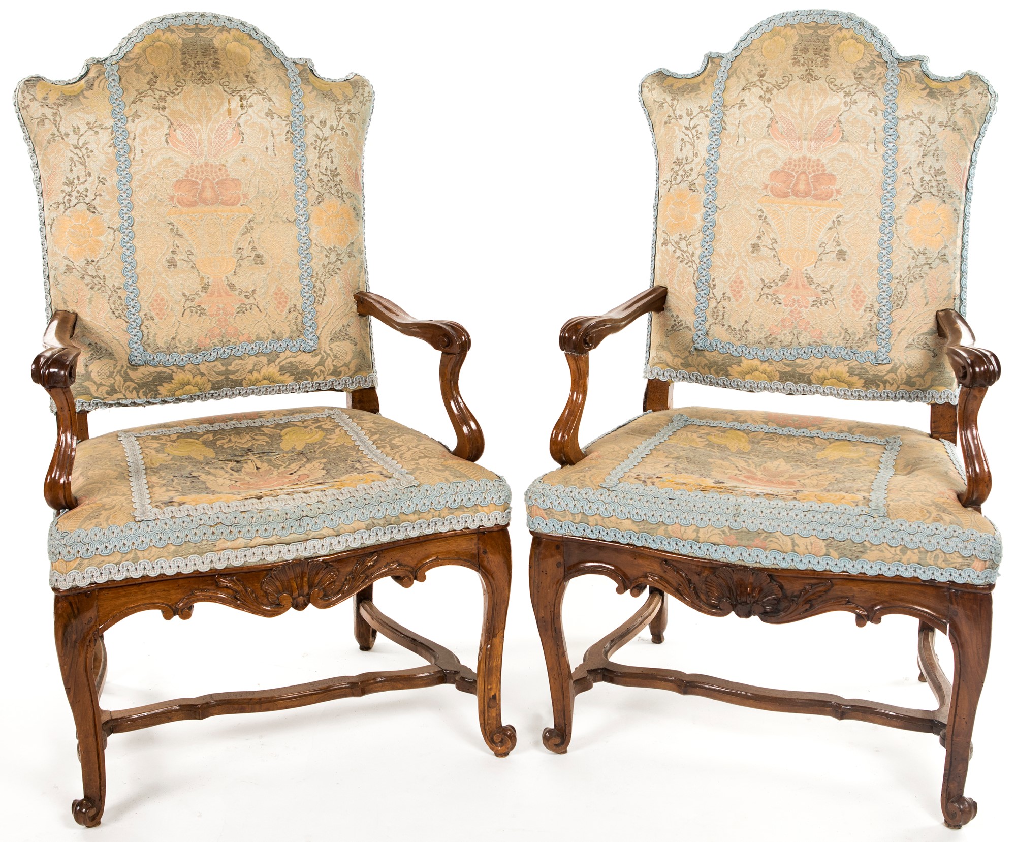 Coppia di poltrone Luigi XV in noce, XVIII secolo, cm 114x65x50, con schienali sagomati e sedili imbottiti rivestiti in tessuto guarnito da passamanerie; braccioli sagomati terminanti a ricciolo, gambe mosse riunite da traverse