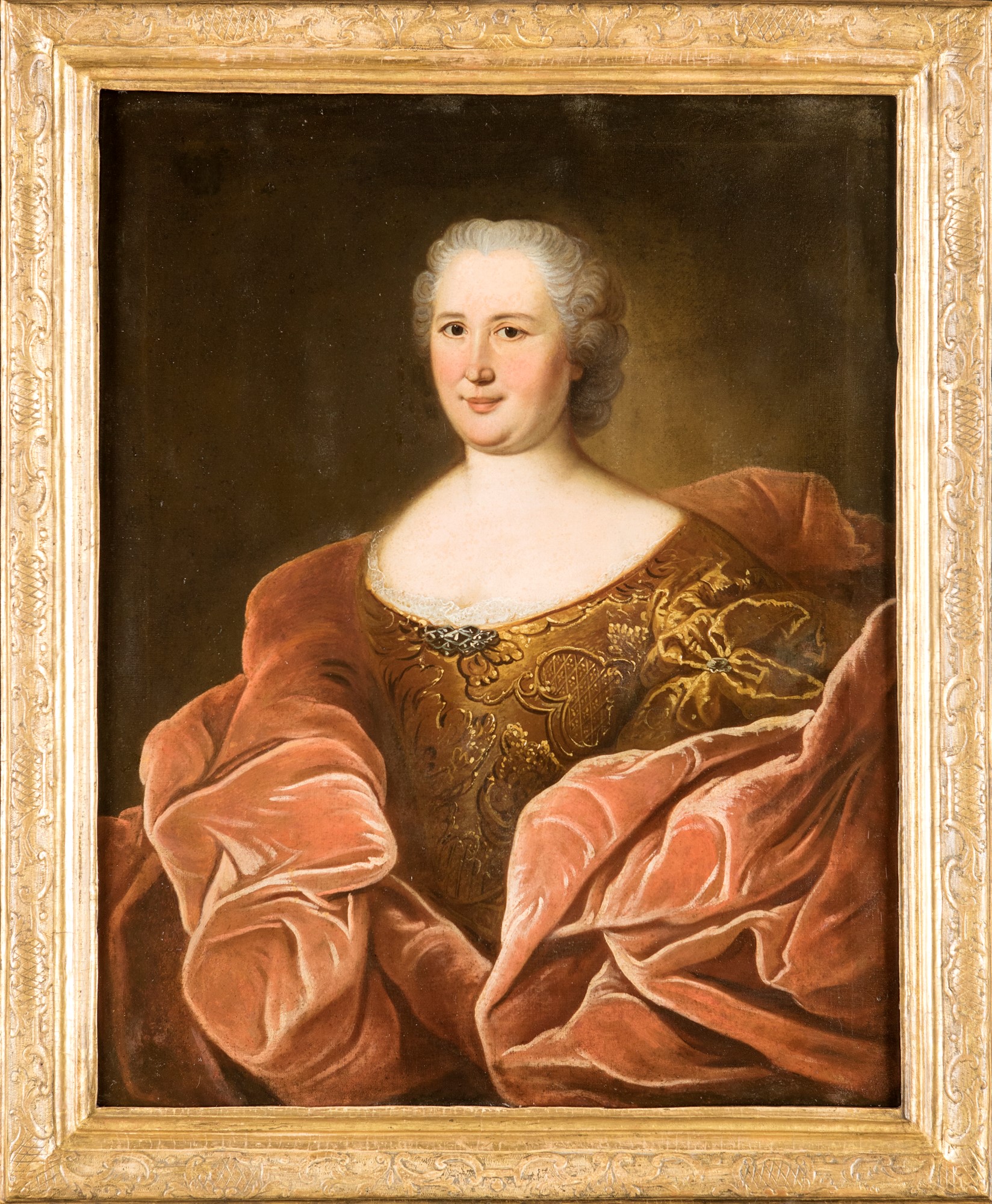 Pittore del XVIII secolo, Ritratto di gentildonna con morbida stola in velluto rosso, olio su tela, cm 81x65 - con la cornice: cm 95x78