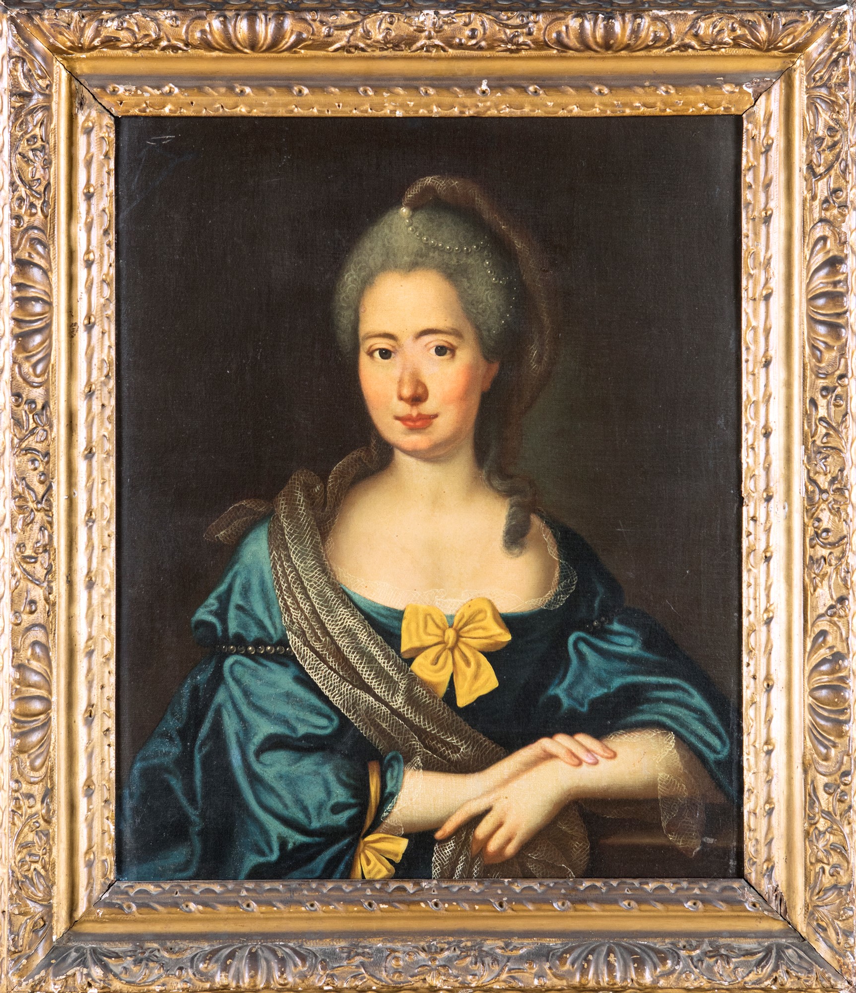 Pittore del XVIII secolo, Ritratto di gentildonna con abito blu e perle fra i capelli, olio su tela, cm 79x62 - con la cornice: cm 97x83