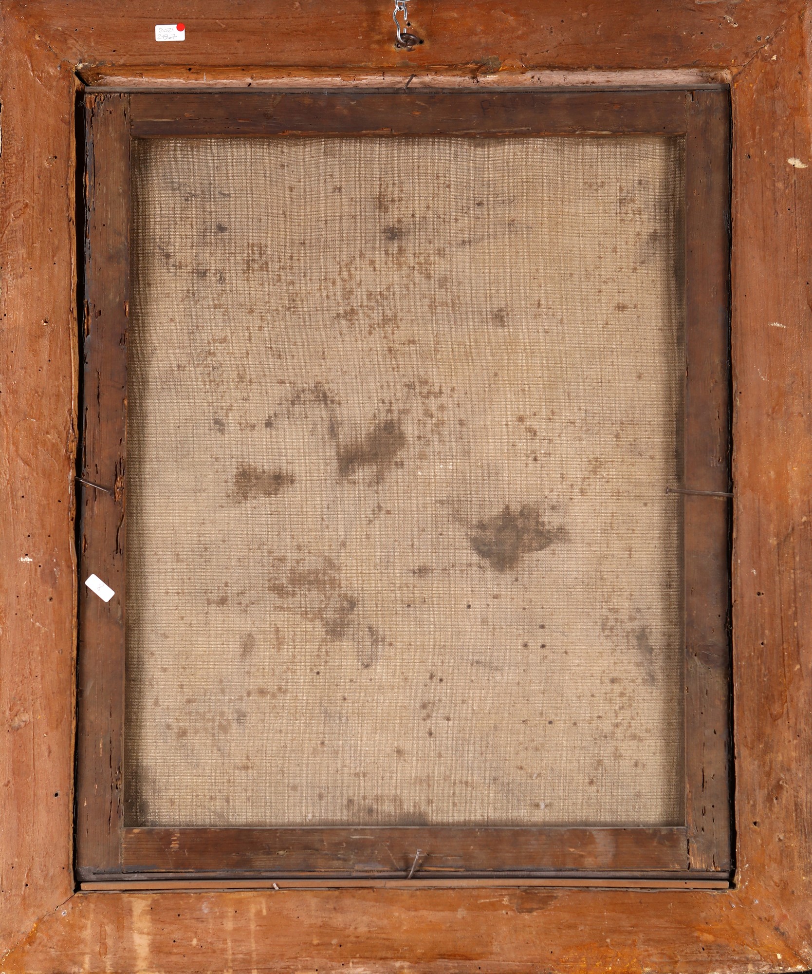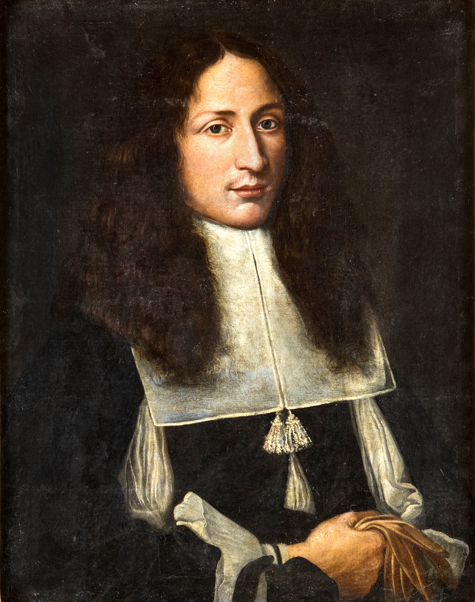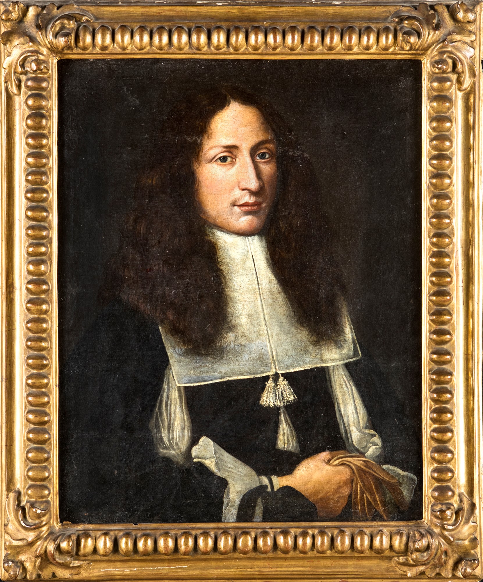 Pittore del XVII secolo, Ritratto di gentiluomo con parrucca, olio su tela, cm 74x60 - con la cornice: cm 91x76, Cornice in legno dorato percorsa da baccelli intagliati