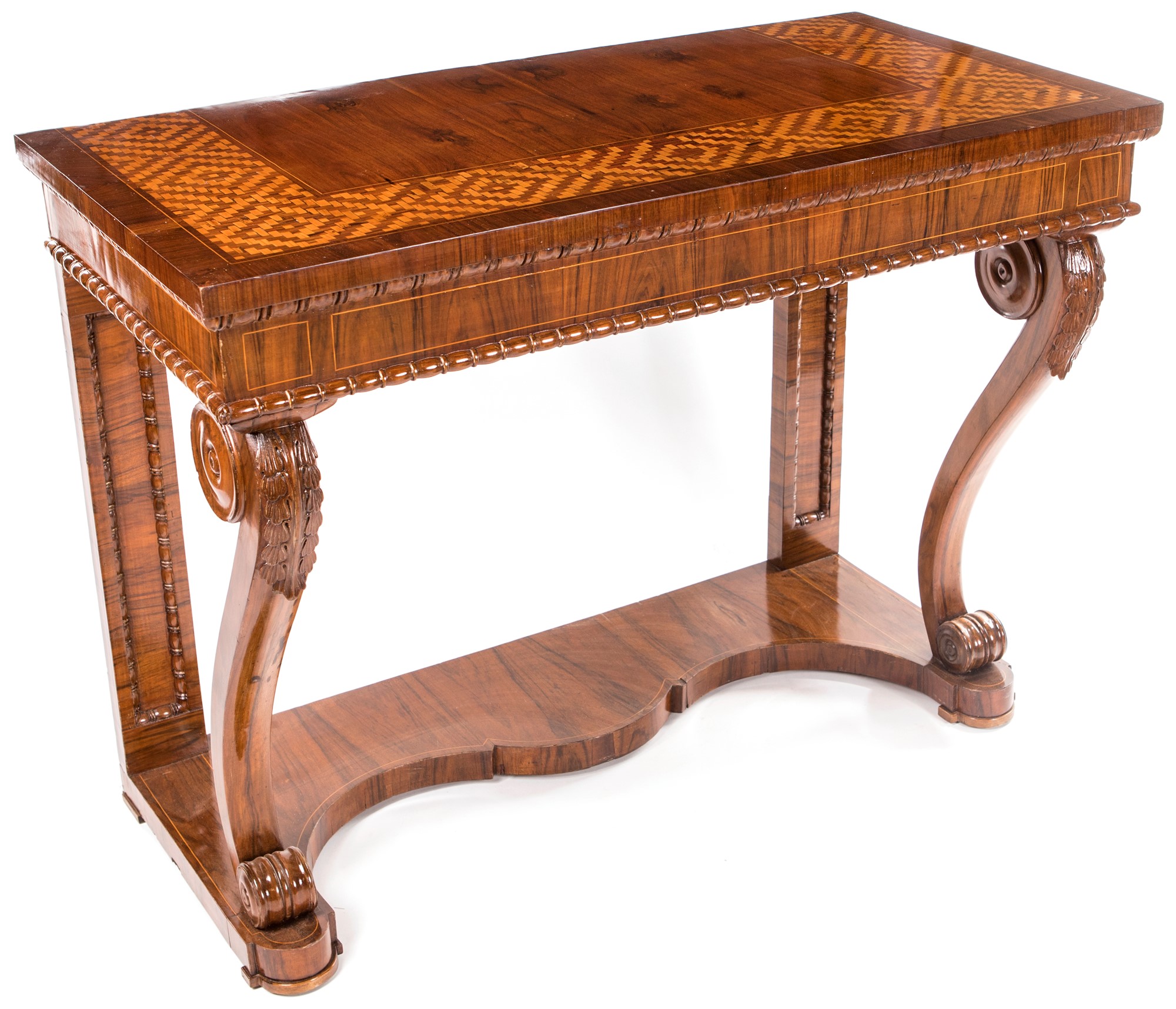 Console in noce d'epoca Carlo X con filettature ed intarsi in legni di frutto, 1830 ca., cm 93,5x122x63, piano rettangolare con ampia bordura intarsiata a tasselli geometrici disposti a simulare un motivo ad intreccio, con profilo sottostante percorso da ovoli; fascia lineare sottolineata da cordolo, montanti anteriori sagomati con estremità superiore a ricciolo, posteriori a lesena poggianti su base sagomata