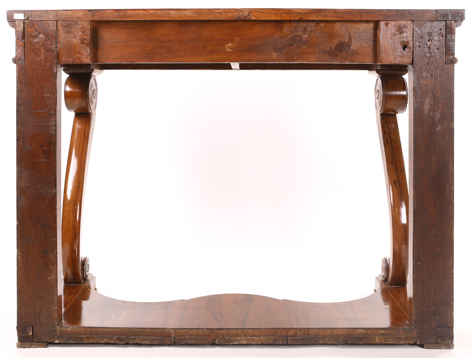 Console in noce d'epoca Carlo X con filettature ed intarsi in legni di frutto, 1830 ca. cm 93,5x122x63