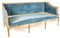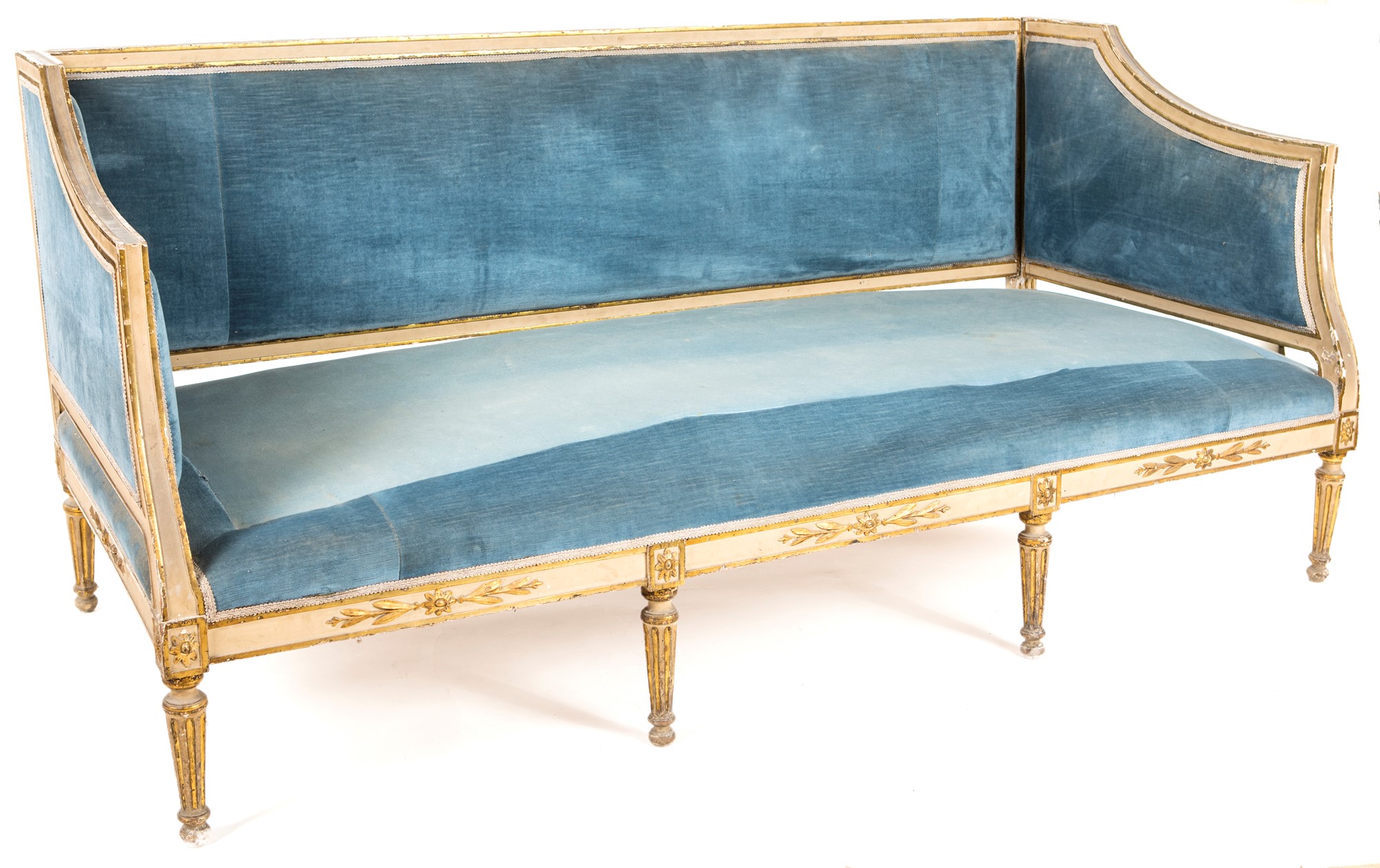 Divano in legno laccato, Napoli fine del XVIII secolo, cm 89x191x88, con cornici lineari, imbottito e rivestito in velluto azzurro; gambe rastremate