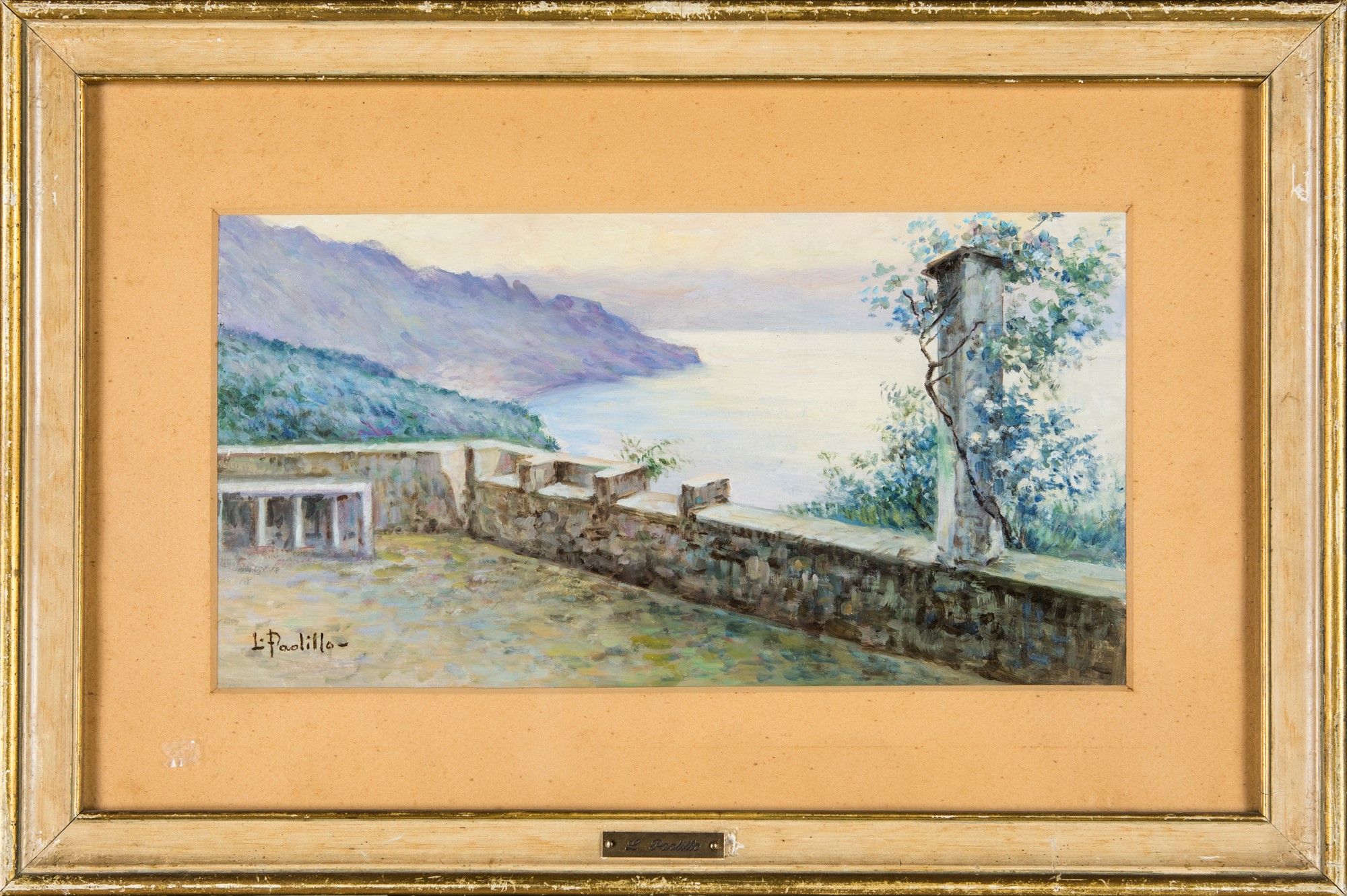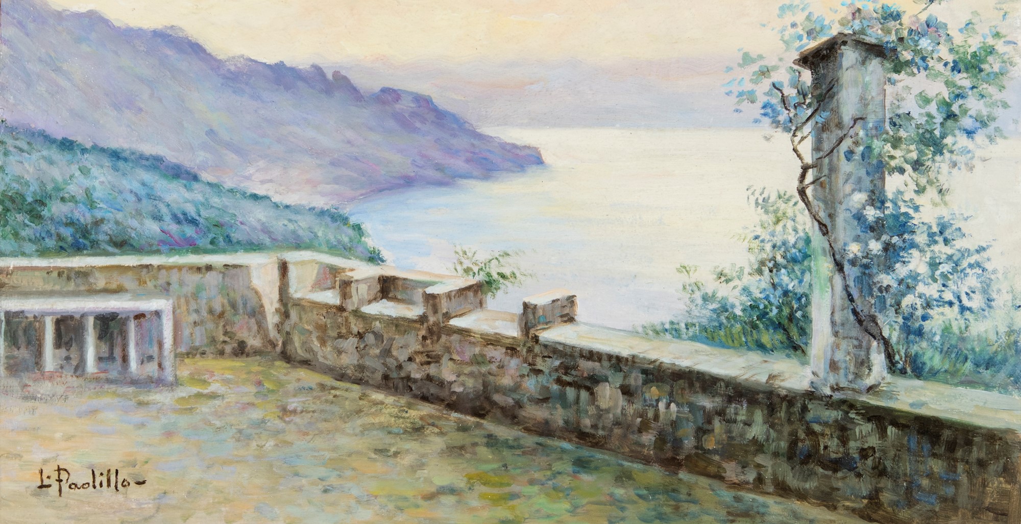 Paolillo, Luigi (Maiori, 1864 - Vietri sul Mare, 1934) , Terrazza sul mare - costiera da Ravello, olio su tavola, cm 21x38 - con la cornice: cm 37x55, Firmato in basso a sinistra: L. Paolillo