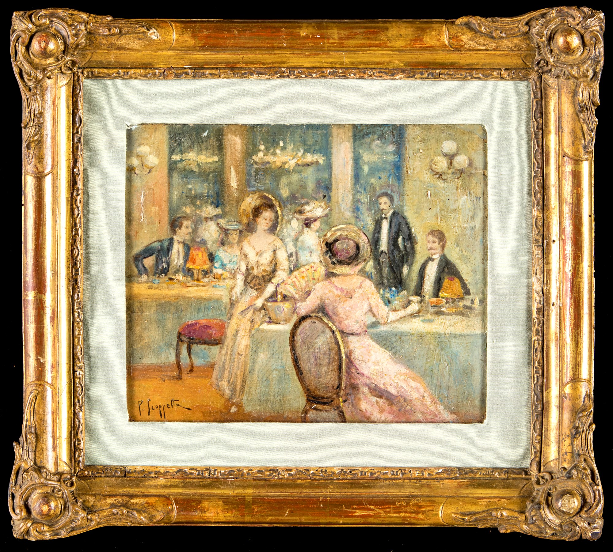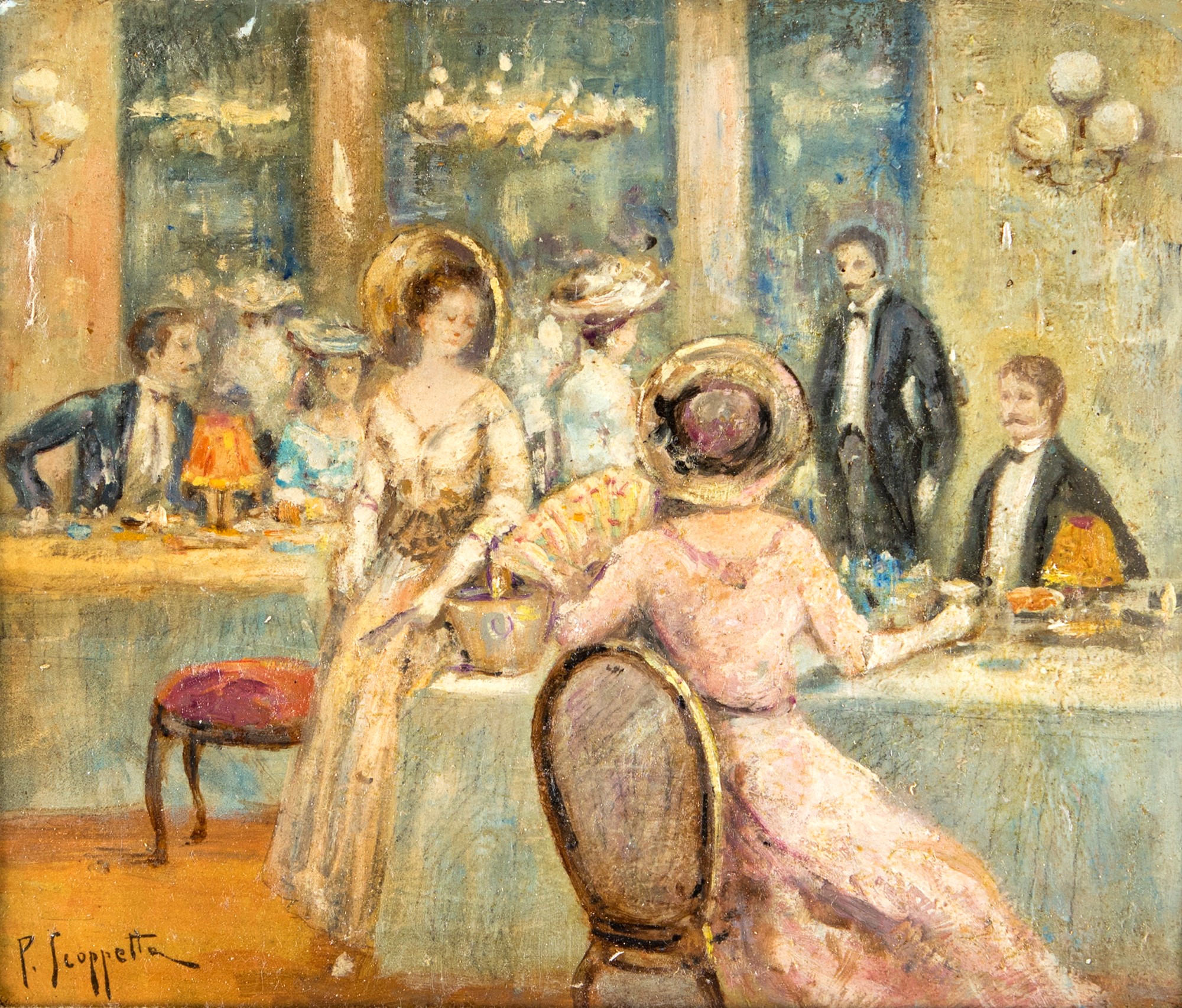 Pietro Scoppetta (1:Principale) (Amalfi, 1863 - Napoli, 1920) , Cafè de la Paix a Parigi, olio su cartone, cm 20x24 - con la cornice: cm 34x38, Firmato P. Scoppetta in basso a sinistra