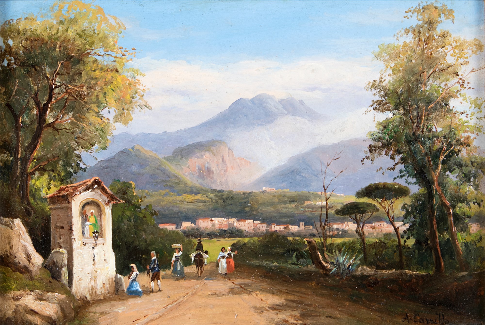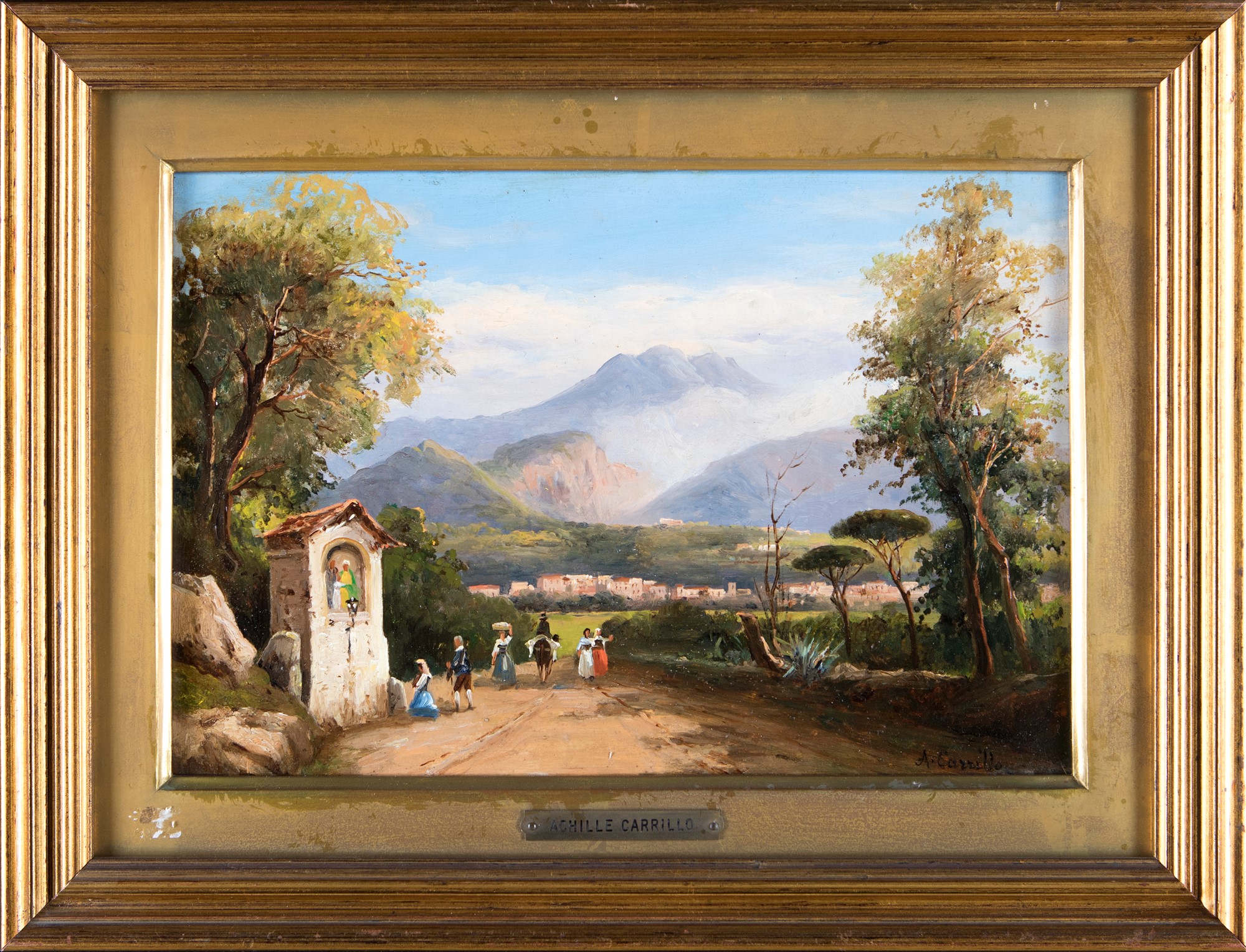 Carrillo, Achille (Avellino, 1818 - ?) , Paesaggio con figure - Cava dei Tirreni, olio su tavola , cm 21,5x31 - con la cornice: cm 32x42, Firmato in basso a destra: A. Carrillo