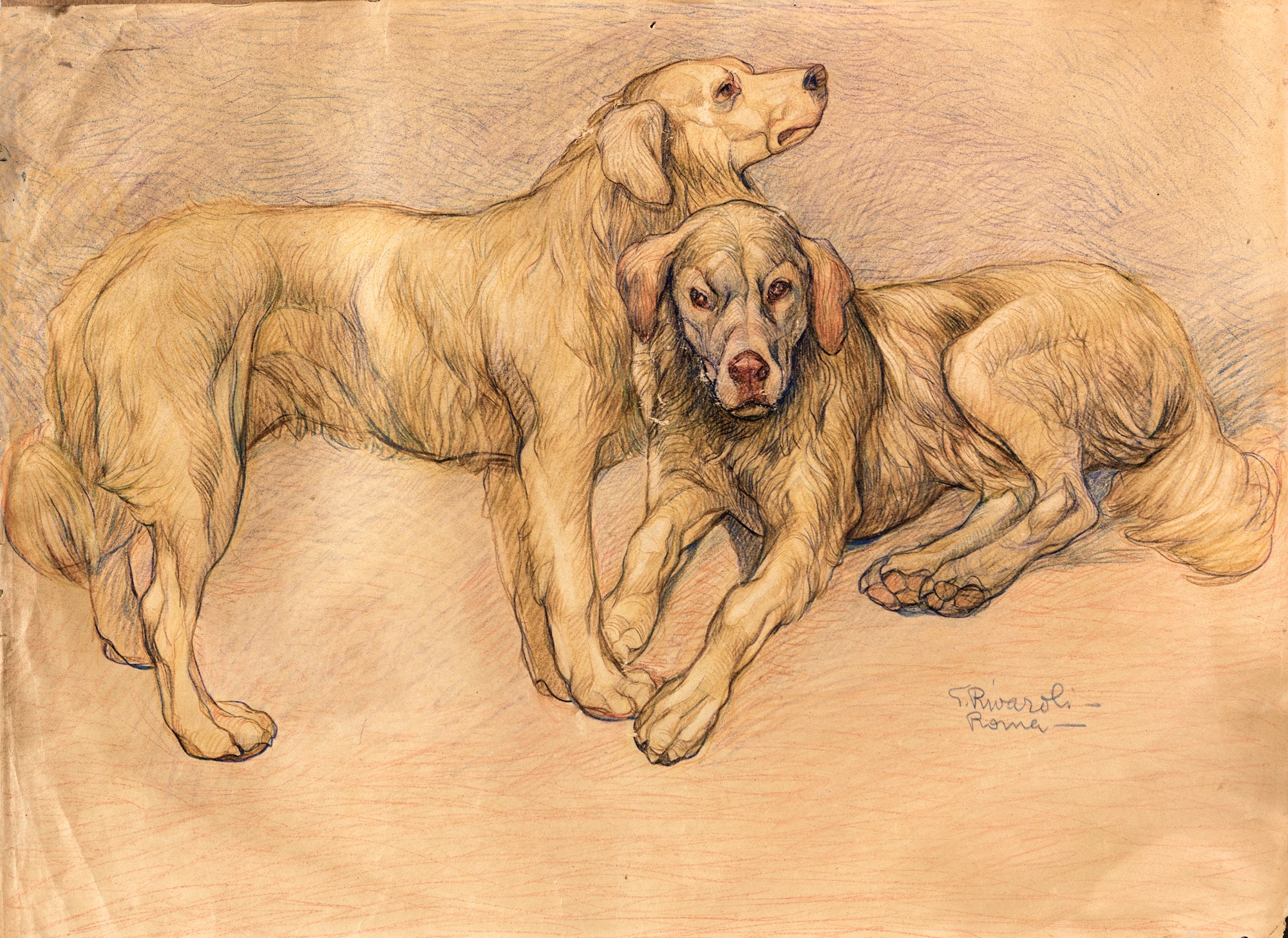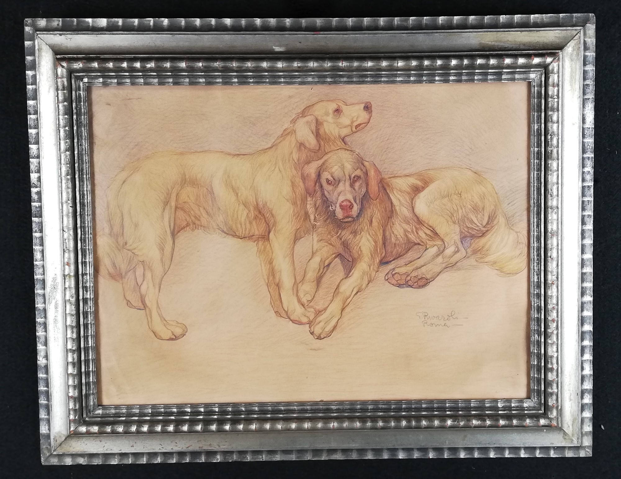 Giuseppe Rivaroli (Cremona, 1885 - Roma, 1943) , Due cani, matite colorate su carta, cm 37x50 - con la cornice: cm 51x64, Firmato in basso a destra: G. Rivaroli Roma