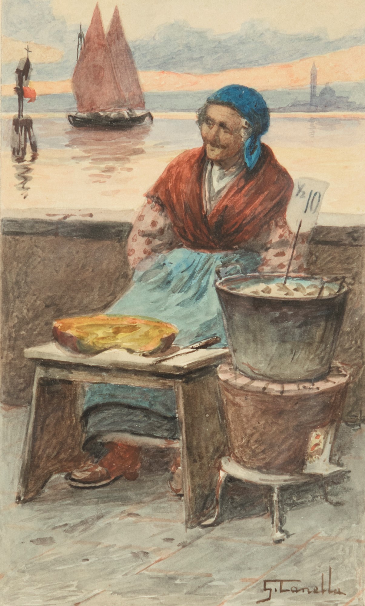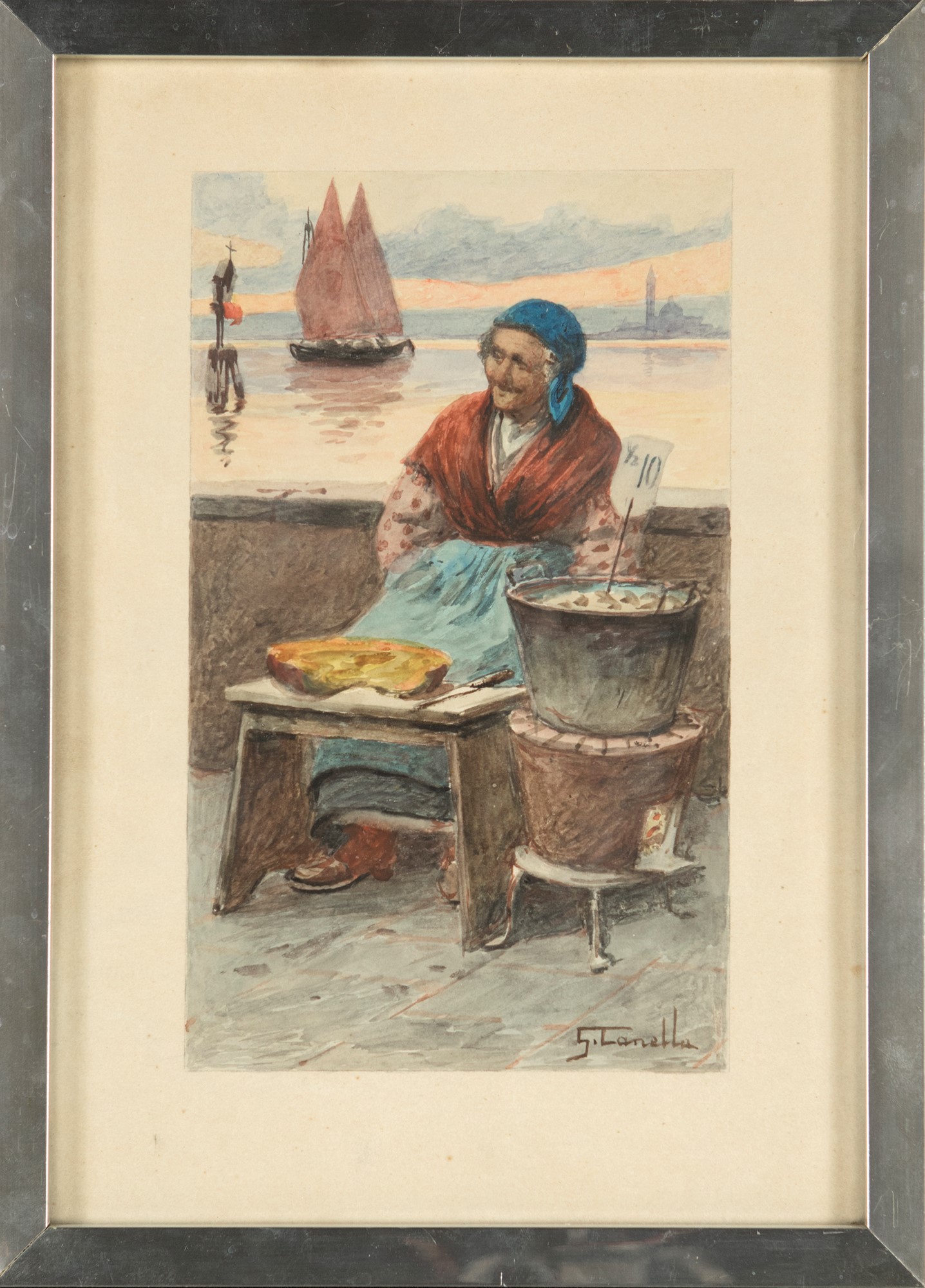 Canella, Giuseppe II (Venezia, 1837 - Padova, 1913) , Venditrice di moeche, pastelli su carta, cm 24,5x15 - con la cornice: cm 35x25,5, Firmato in basso a destra: G. Canella