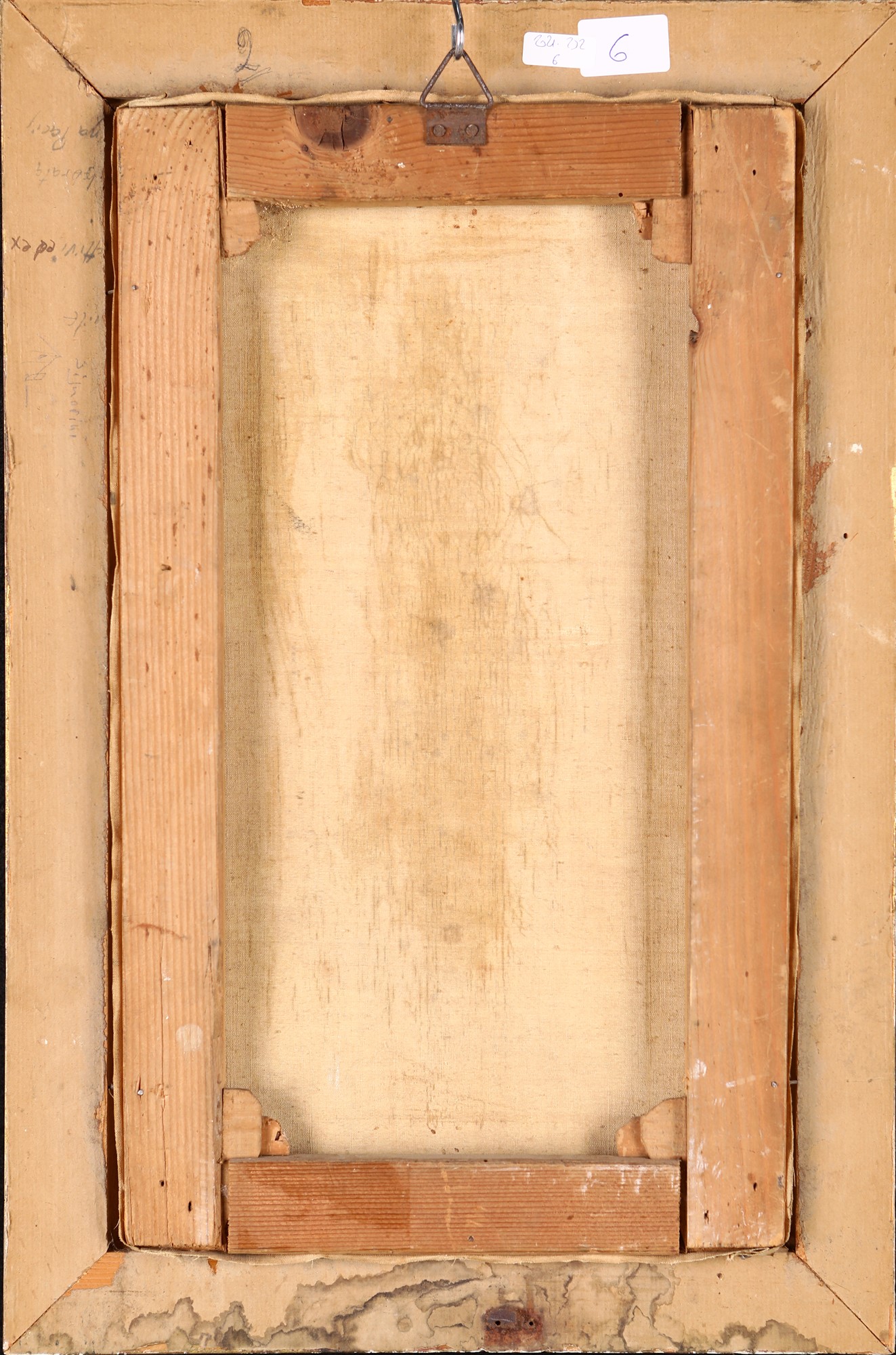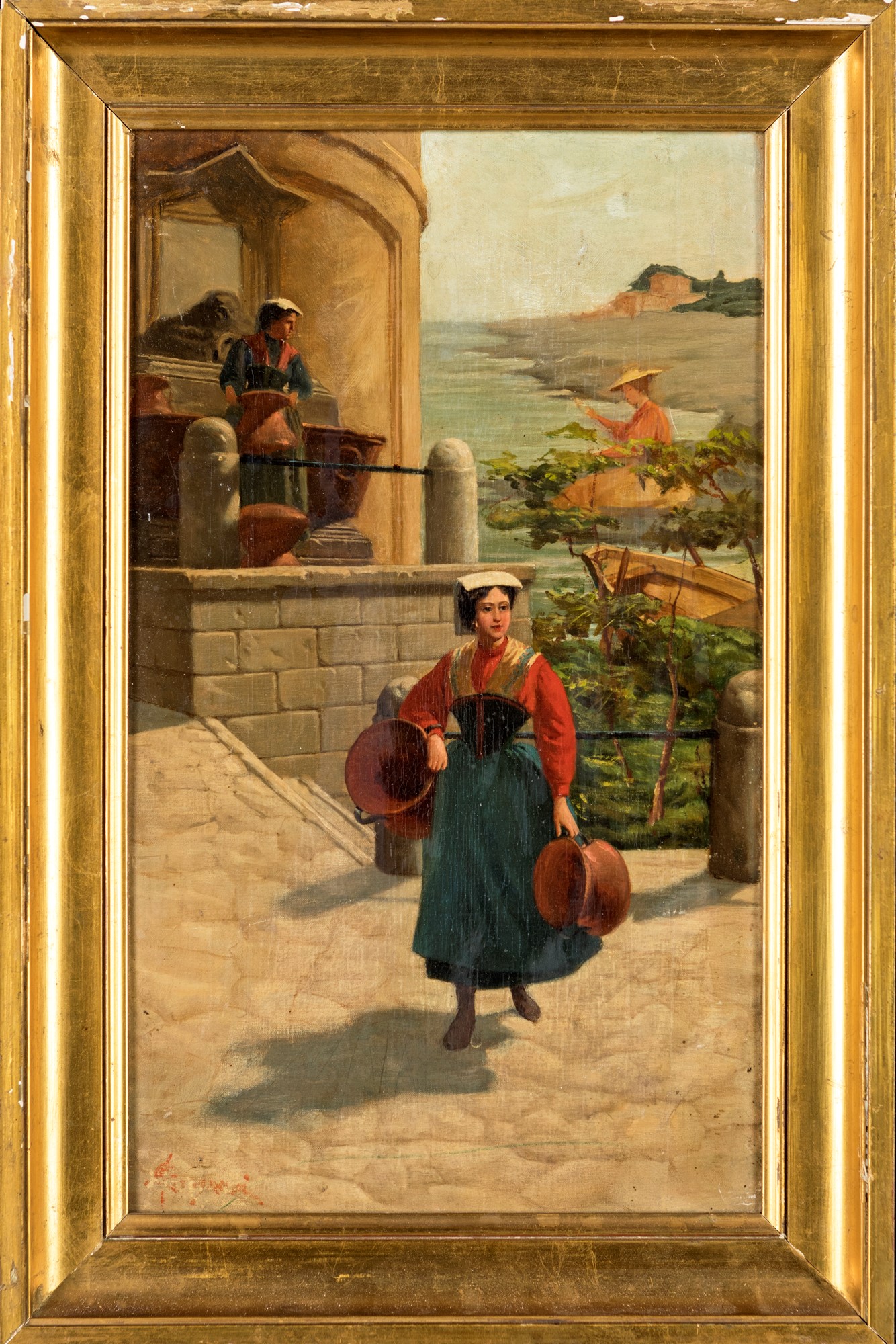 Scuola romana del XIX secolo, Donne alla fontana, olio su tela, cm 43x25 - con la cornice: cm 51x34
