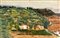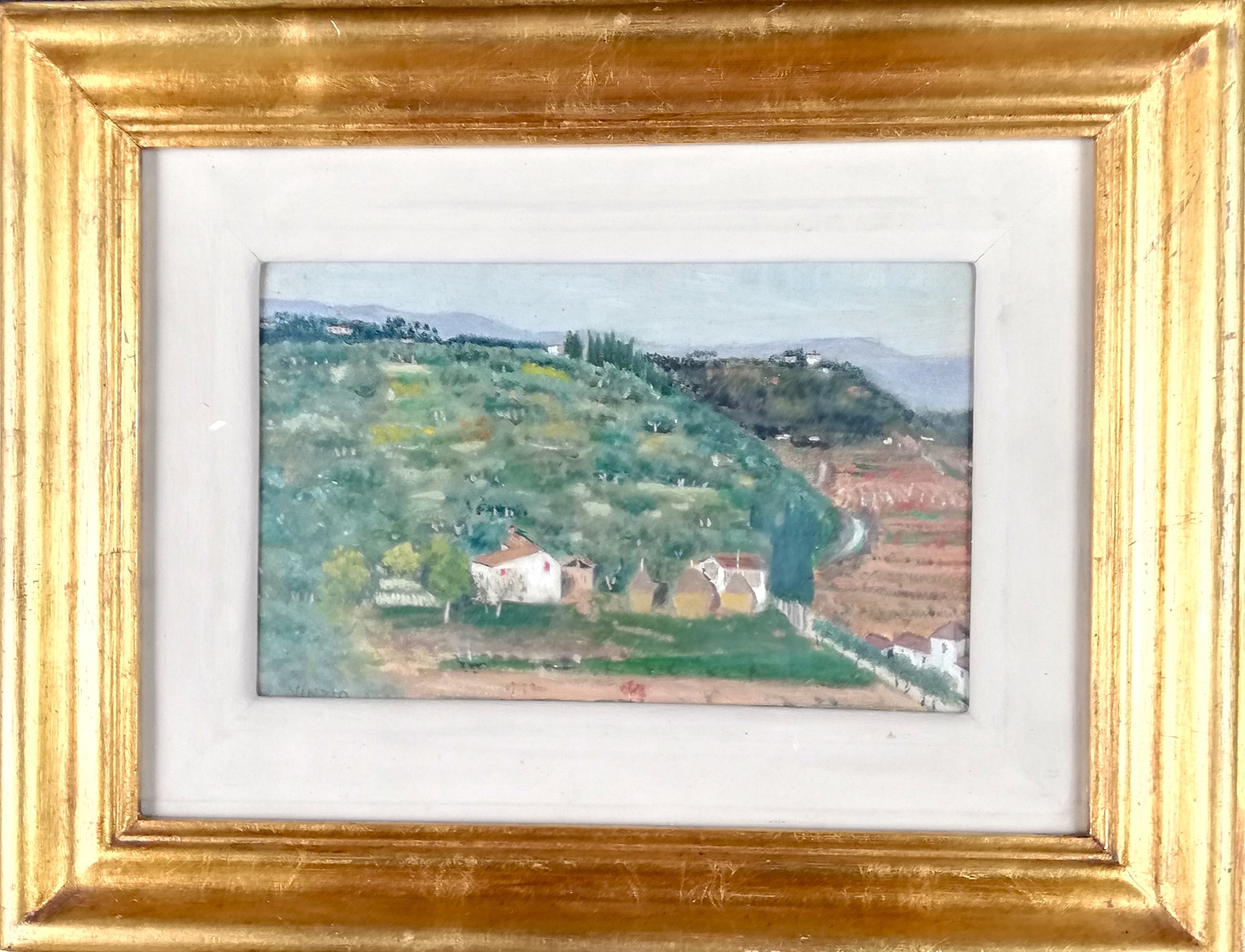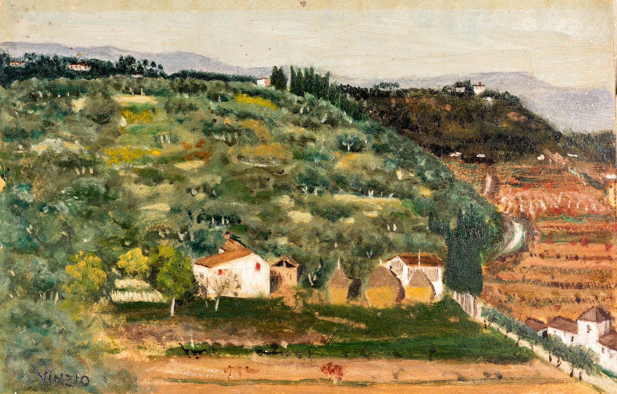 Vinzio, Giulio Cesare (Livorno, 1881 - Milano, 1940) Paesaggio agreste con case e covoni olio su cartoncino cm 15x24 - con la cornice: cm 34x43