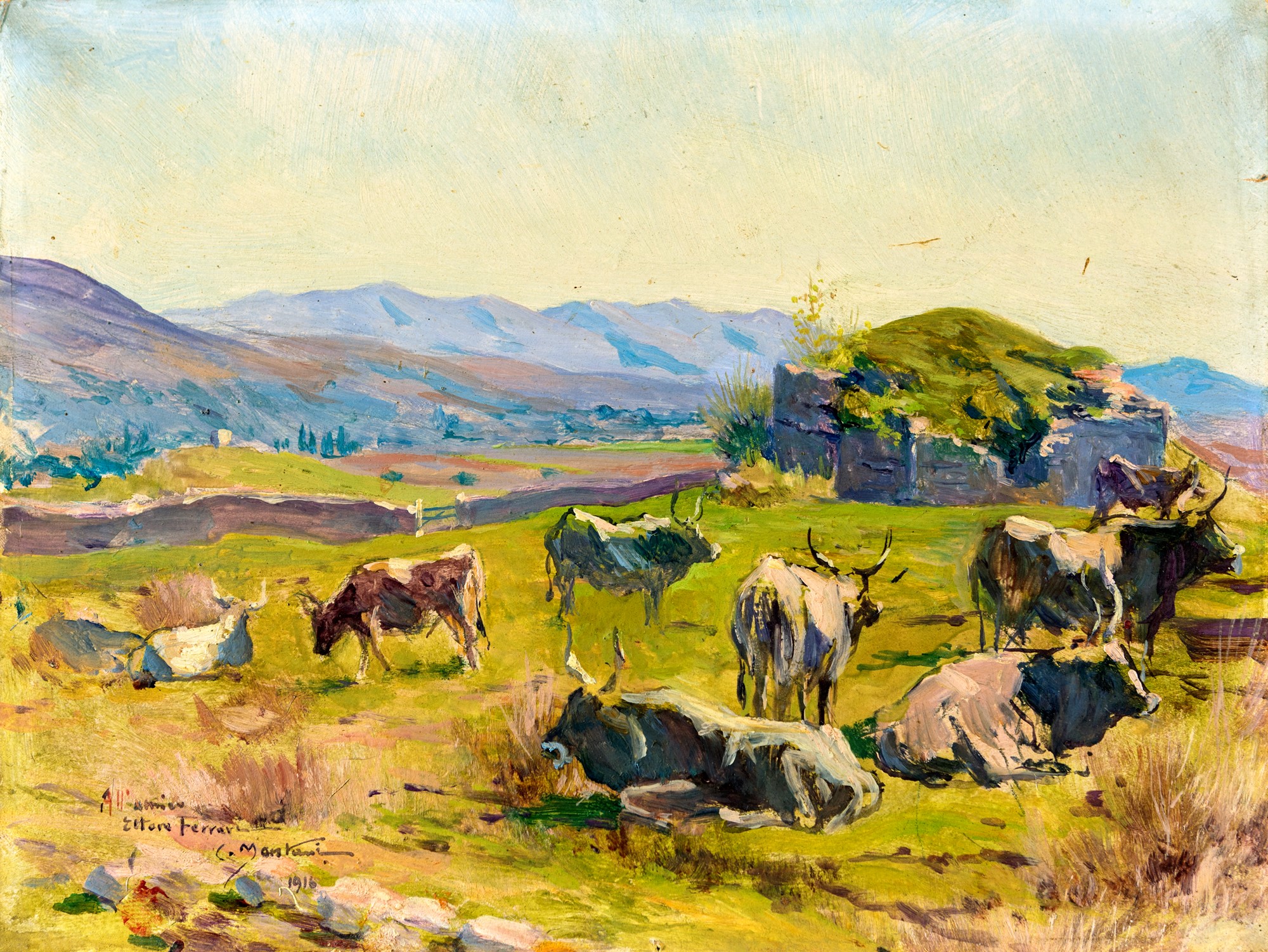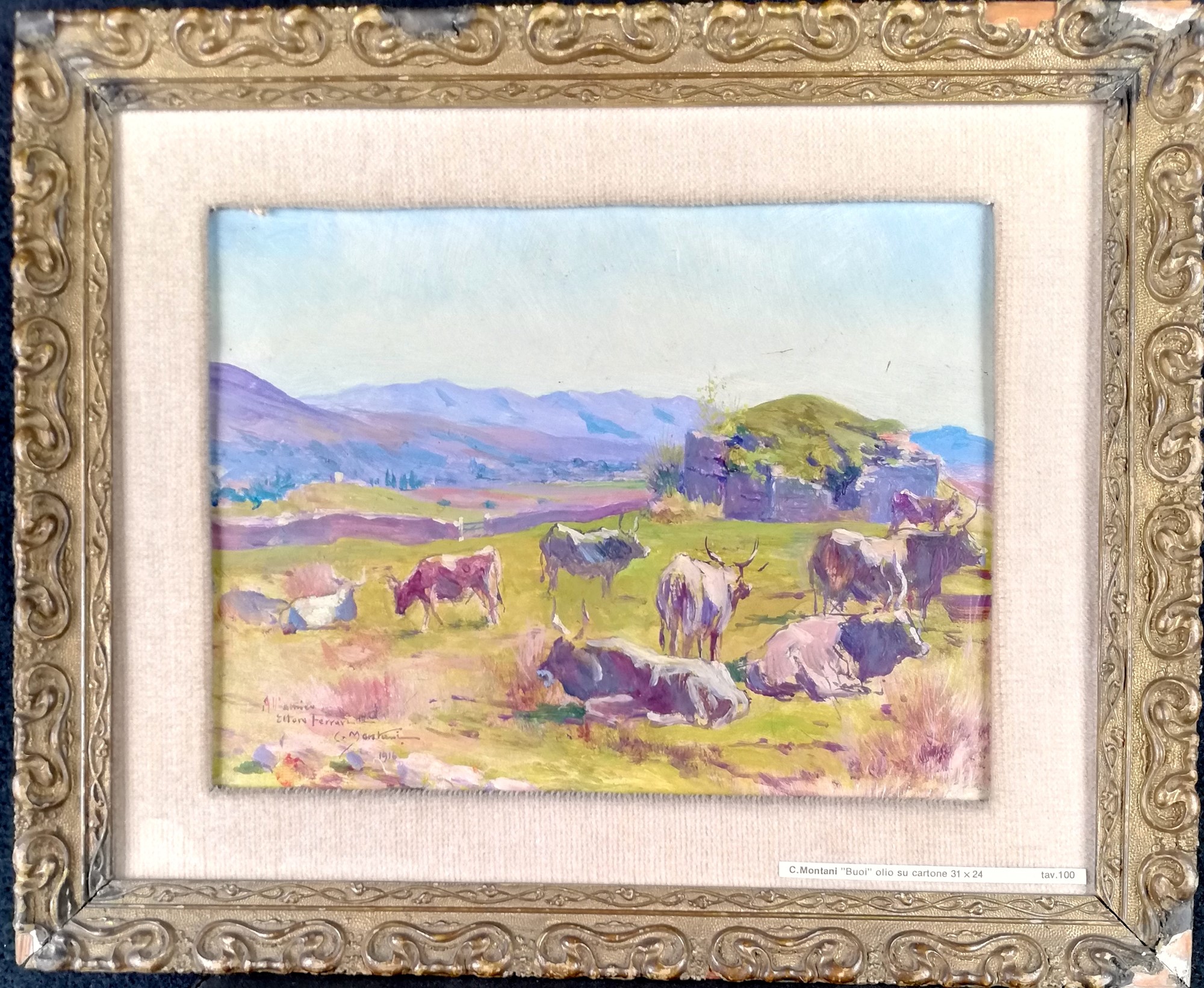 Carlo Montani (Saluzzo, 1868 - Roma, 1936), Paesaggio con buoi, olio su cartone, cm 32x31 - con la cornice: cm 35x43, Dedica ad personam, firma e data 1916 in basso a sinistra. Al verso timbro della Casa delle Aste srl, Palazzo Bernini, via della Mercede 12a, Roma