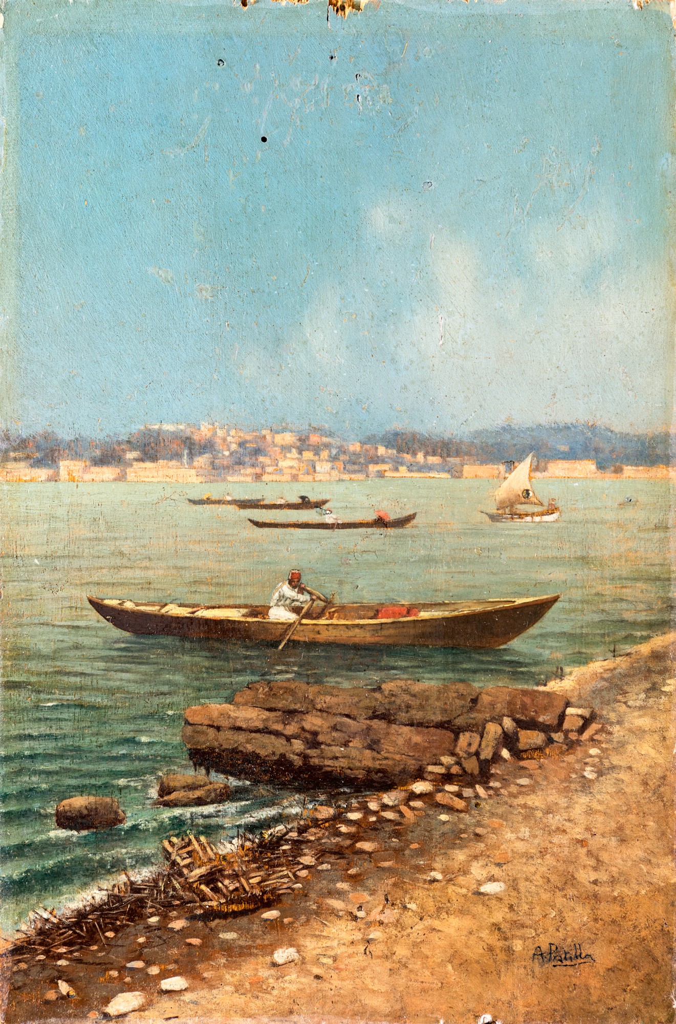 Attilio Pratella (Lugo, 1856 - Napoli, 1949) , Barca a Mergellina, olio su tavola, cm 30x20 - con la cornice: cm 44x36, Firmato in basso a destra: A. Pratella
