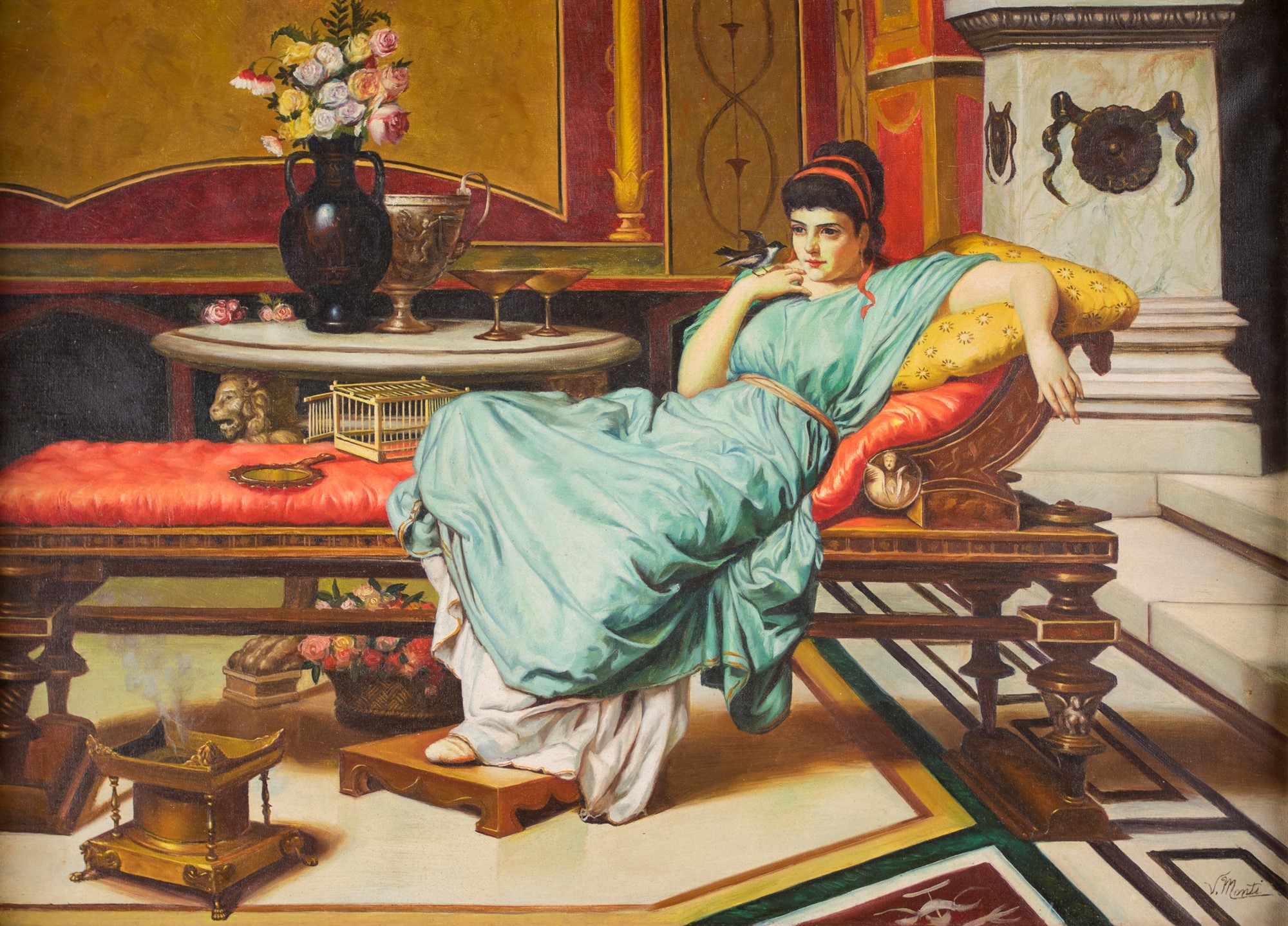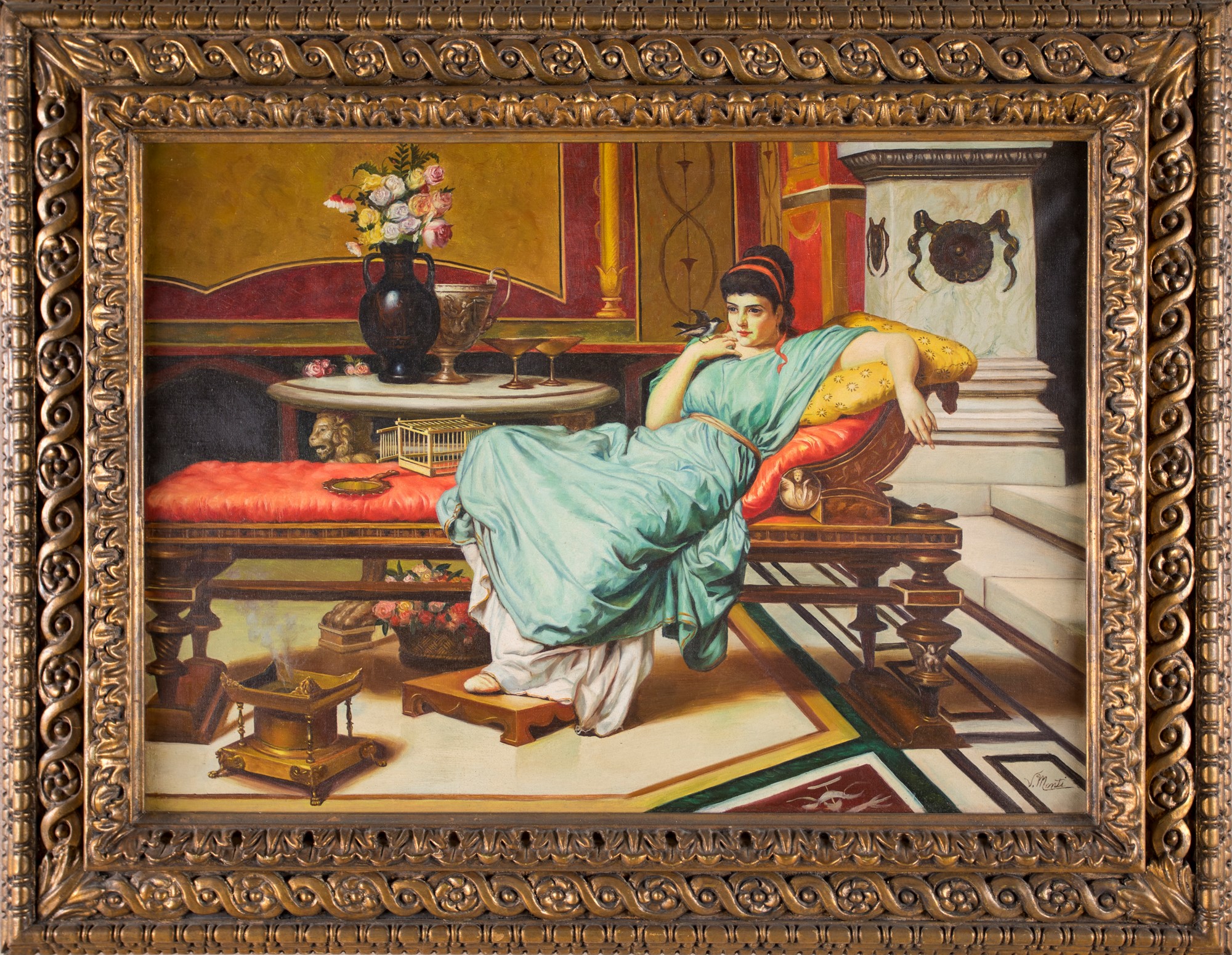 Virginio Monti (Genzano di Roma, 1852 - Roma, 1942) , Interno neoclassico, olio su tela, cm 49,5x70 - con la cornice: cm 71x91, Firmato in basso a destra: V. Monti