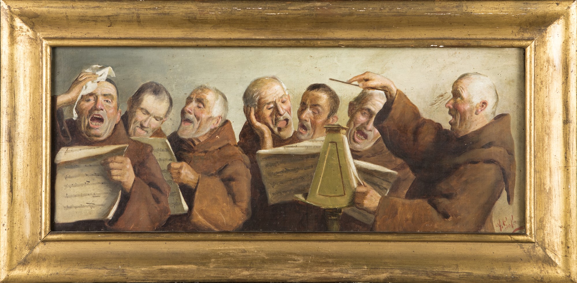 Pittore degli inizi del XX secolo, Le prove del coro, olio su tela, cm 20,5x50,5 - con la cornice: cm 29x59, Firma non interamente decifrabile in basso a destra