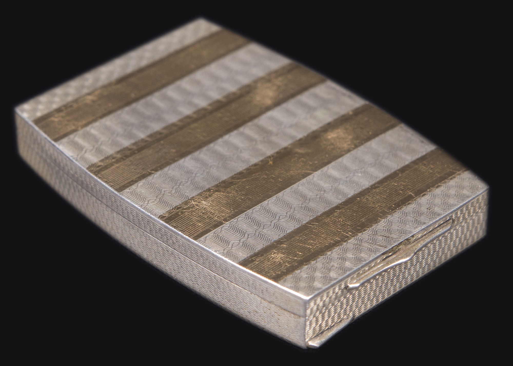 Tabacchiera in oro 18 Kt e argento 800, Anni Venti/Trenta, cm 5,7x8,4x1,2, con superficie esterna interamente decorata da fasce alternate incise al bulino